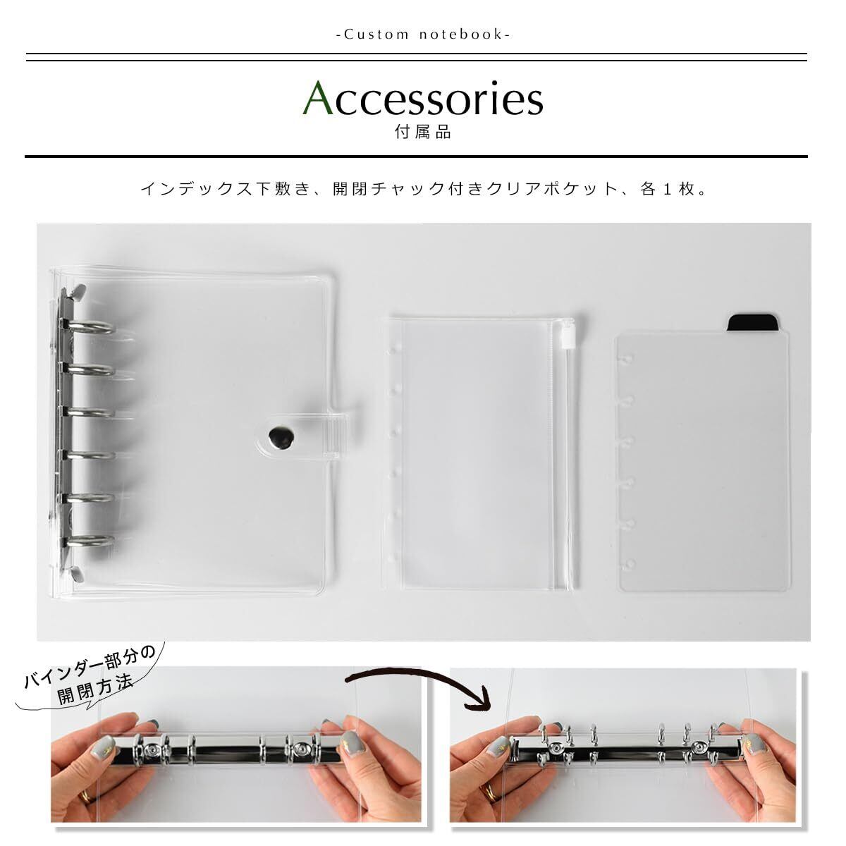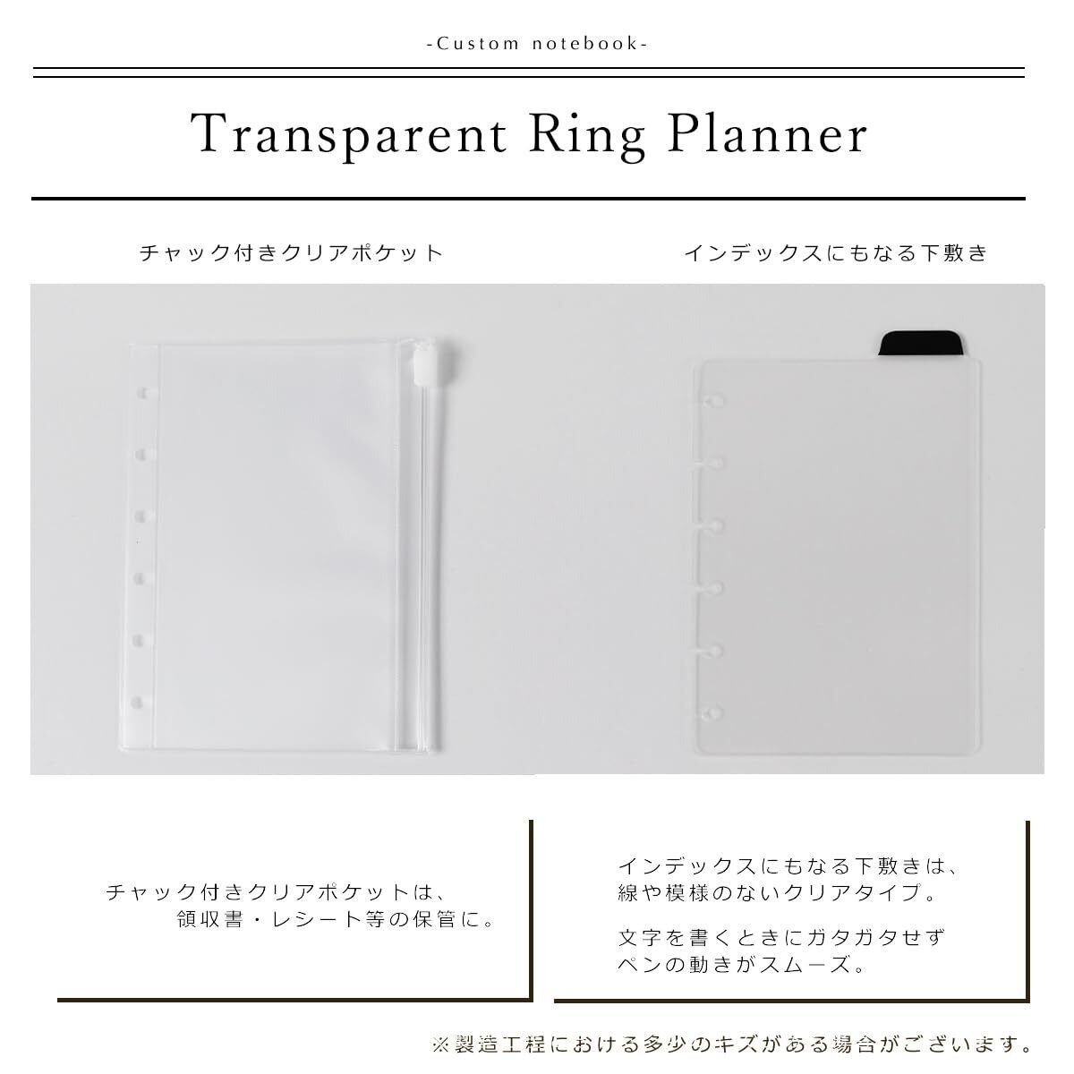 【便利な付属品】 チャック付きのクリアポケットは、領収書やレシートの保存に便利。ハリのある適度な厚みなので、シワになりにくい。インデックスにもなる透明下敷きは、模様や線のない完全クリアタイプ。文字を書くときにガタガタせずペンの運びがスムーズ。