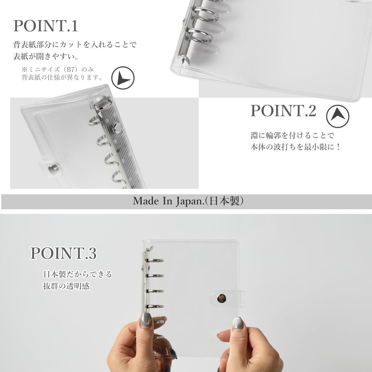 【日本製】 細部にまでこだわった日本製。素材の透明感や美しさ、Made in Japanだからできる高品質な仕上がり。手帳の横幅も広げ、リフィルやクリアポケットがサイドからはみ出ない。