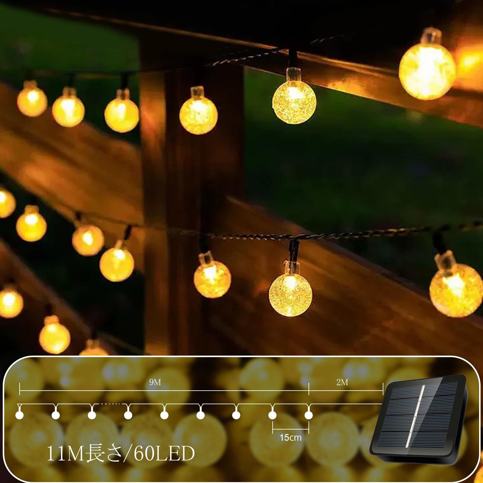AGOTD ソーラー LED ストリングライト 60電球11M イルミネーション 8種点灯モード 屋外 おしゃれ IP65防水 フェアリー 夜間自動点灯 クリスマス/室内/キャンプ/アウトドア/テント/結婚式/庭/パーティー/新年/ハロウィン 飾り 暖色