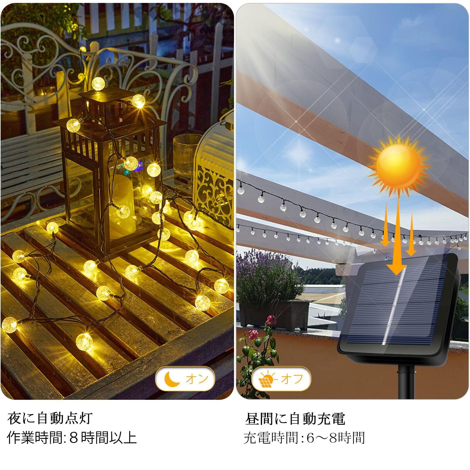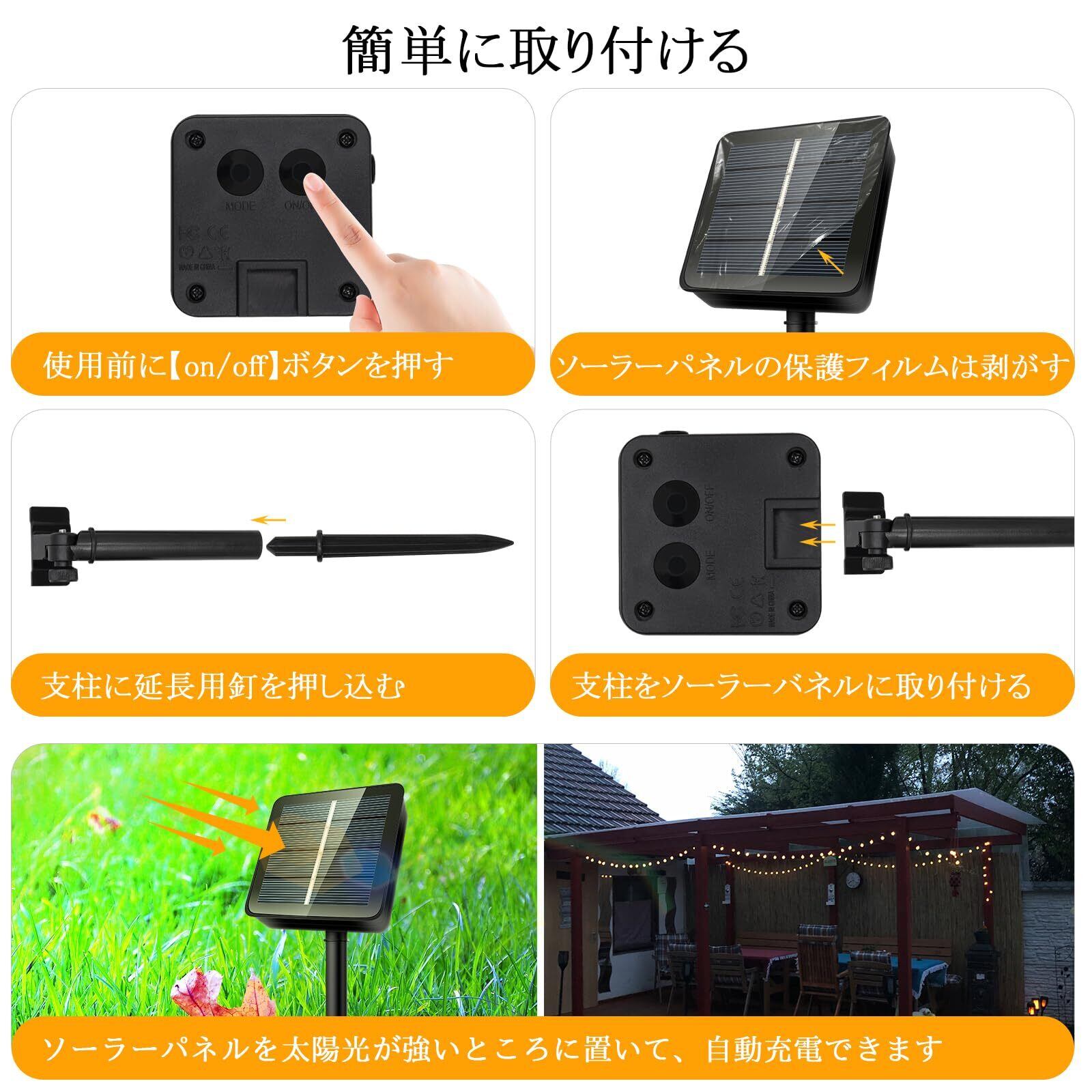 【電気代0円!省エネ】ソーラーパネルに1200mAhのバッテリーが内蔵されて、ソーラーパネルで充電するので、電源不要で電気代0円!省エネの上に環境に優しいです。昼間で8時間以上充電すると、10時間以上の連続点灯ができます。