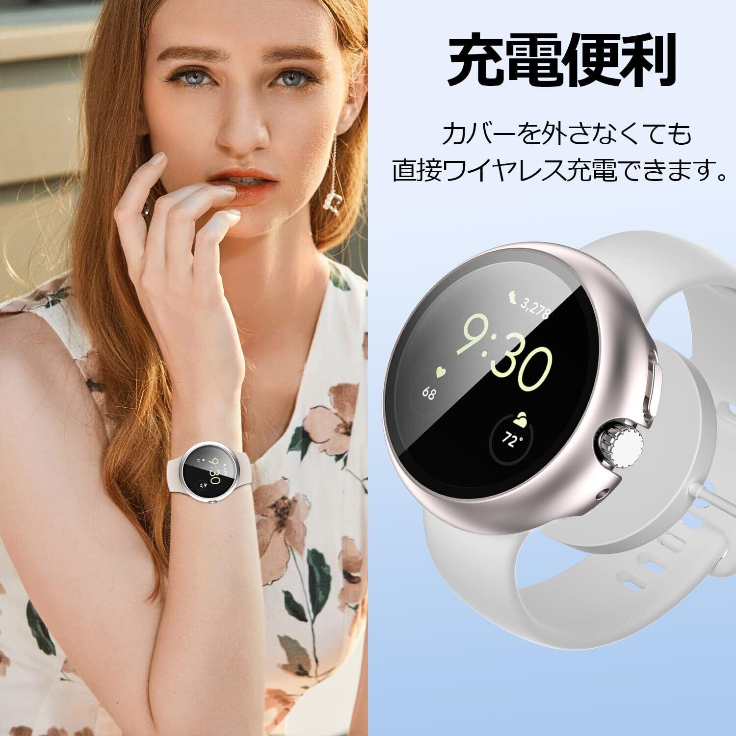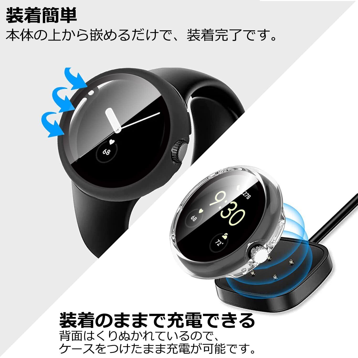 「装着のままで充電できる」背面はくりぬかれているので、ケースをつけたまま充電が可能です。対応機種:Google Pixel Watch 2/Pixel Watch / グーグル ピクセル ウォッチ2