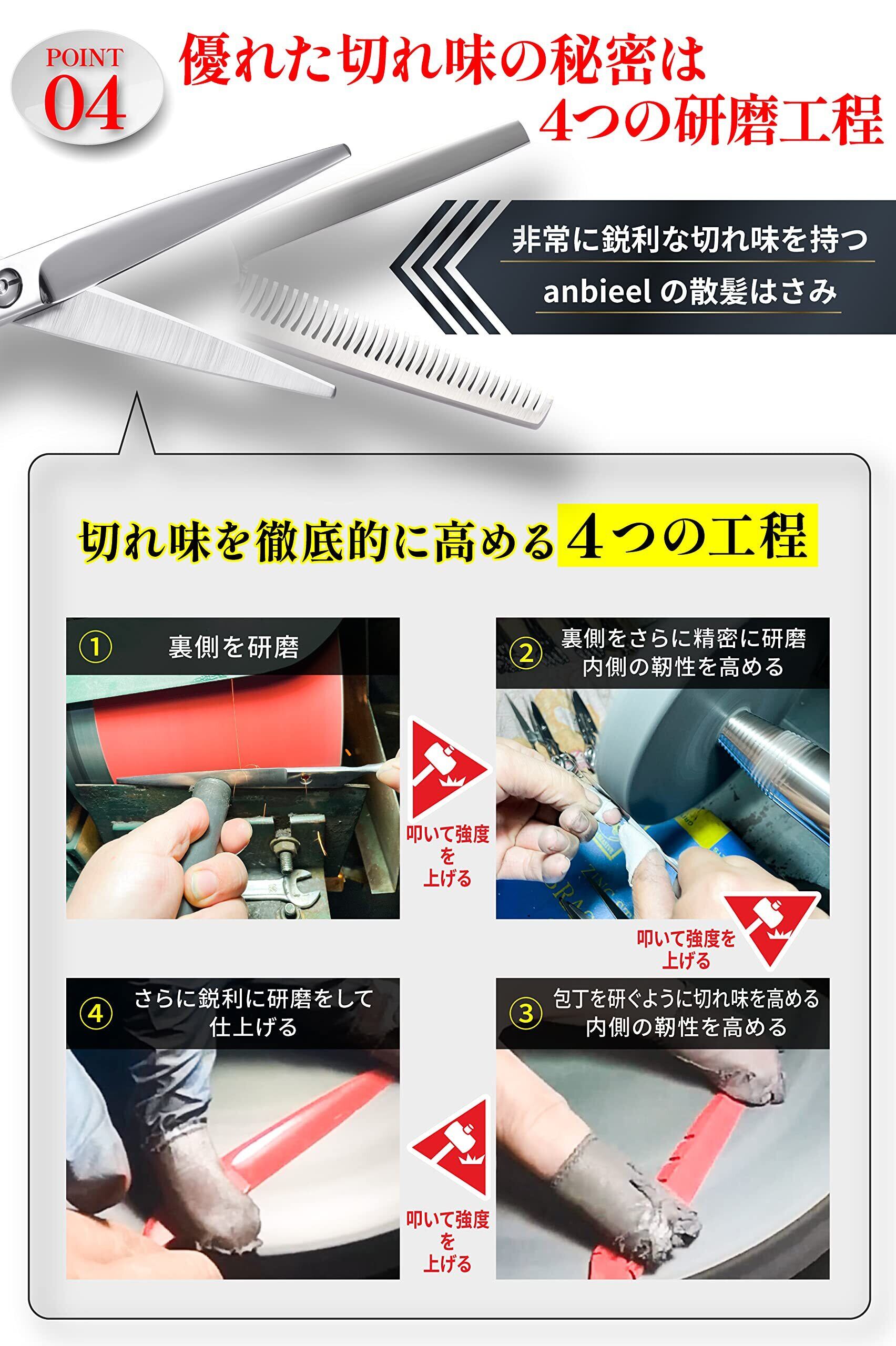 【”サクッ”と切れる刃の秘密は研磨工程】非常に鋭利な切れ味を持つanbieelのはさみ。「セルフカット用のはさみは切れ味が悪くて使いにくい」悩みを解消するため、切れ味を徹底的に高める4つの研磨工程を経て出荷しています。 素材は耐久性に優れた高品質の”4CRステンレススチール”を採用。焼き入れを行い、高度と靭性を強化し「切れ味のよさ」を追求いたしました。