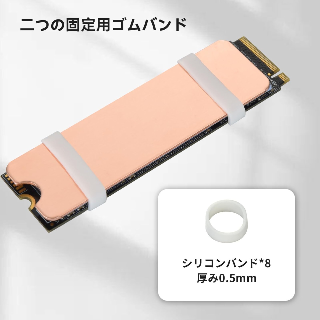【簡単に取り付け】付属の熱伝導シートをSSDのチップのある部分に貼り付け、シリコンバンドで固定します。導熱接着シートとの併用により効率的に熱を逃がすことができます。