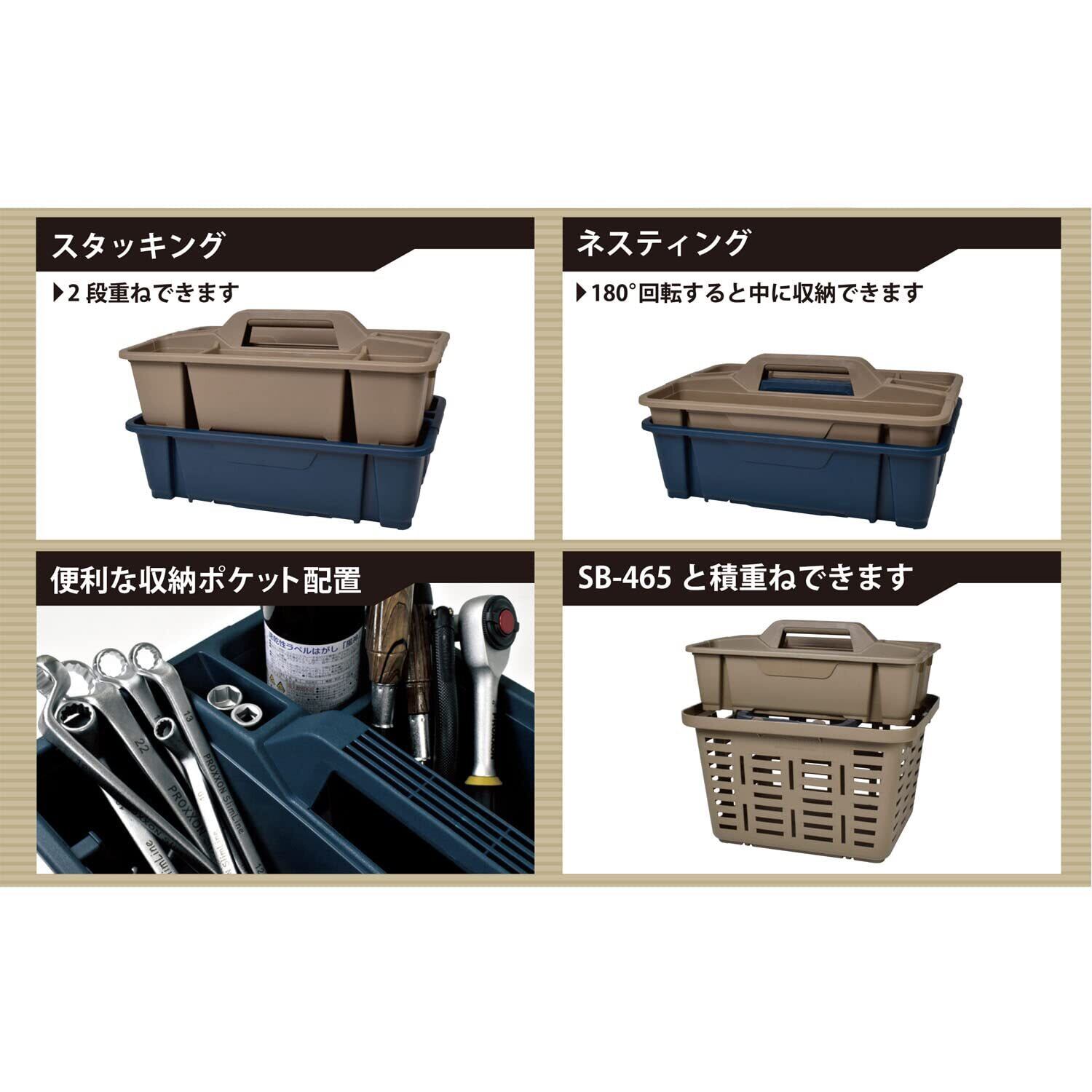 ビジネスもプライベートも、タフさと多様さで充実【特徴】・軽くて持ち運びが簡単・小分け収納スペース6箇所、最長約400mmの物を収納できる・便利な収納ポケット配置・高耐衝撃性コーポリマー使用・2段重ねができる・180度回転すると中に収納できる・SB-465と積重ねができる