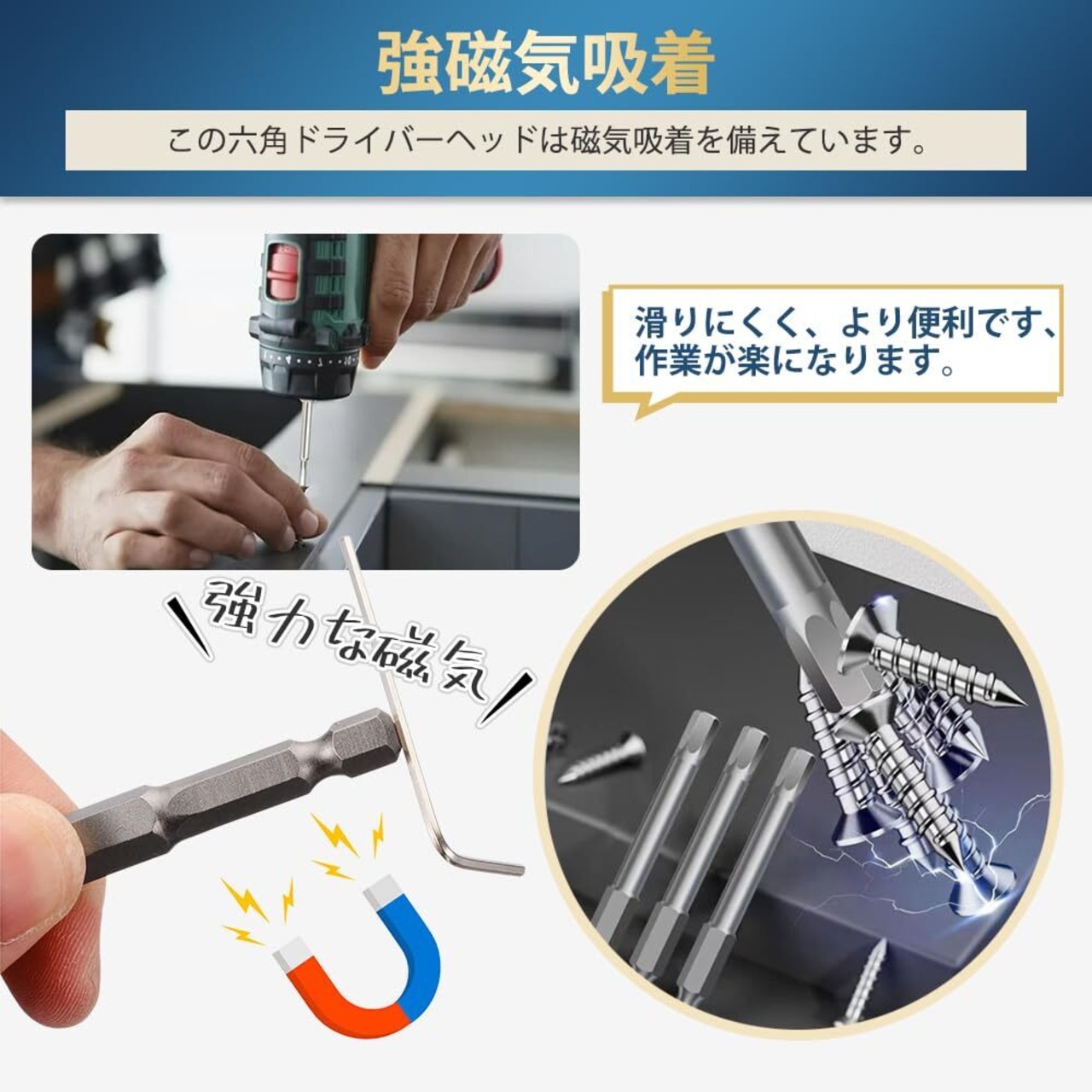 【幅広い用途】車両整備、家具組立、建具、工場内作業等に適しています。これらのビットは、電気ドリル、電動スクリュードライバー、エアドリルなどに適しています。
