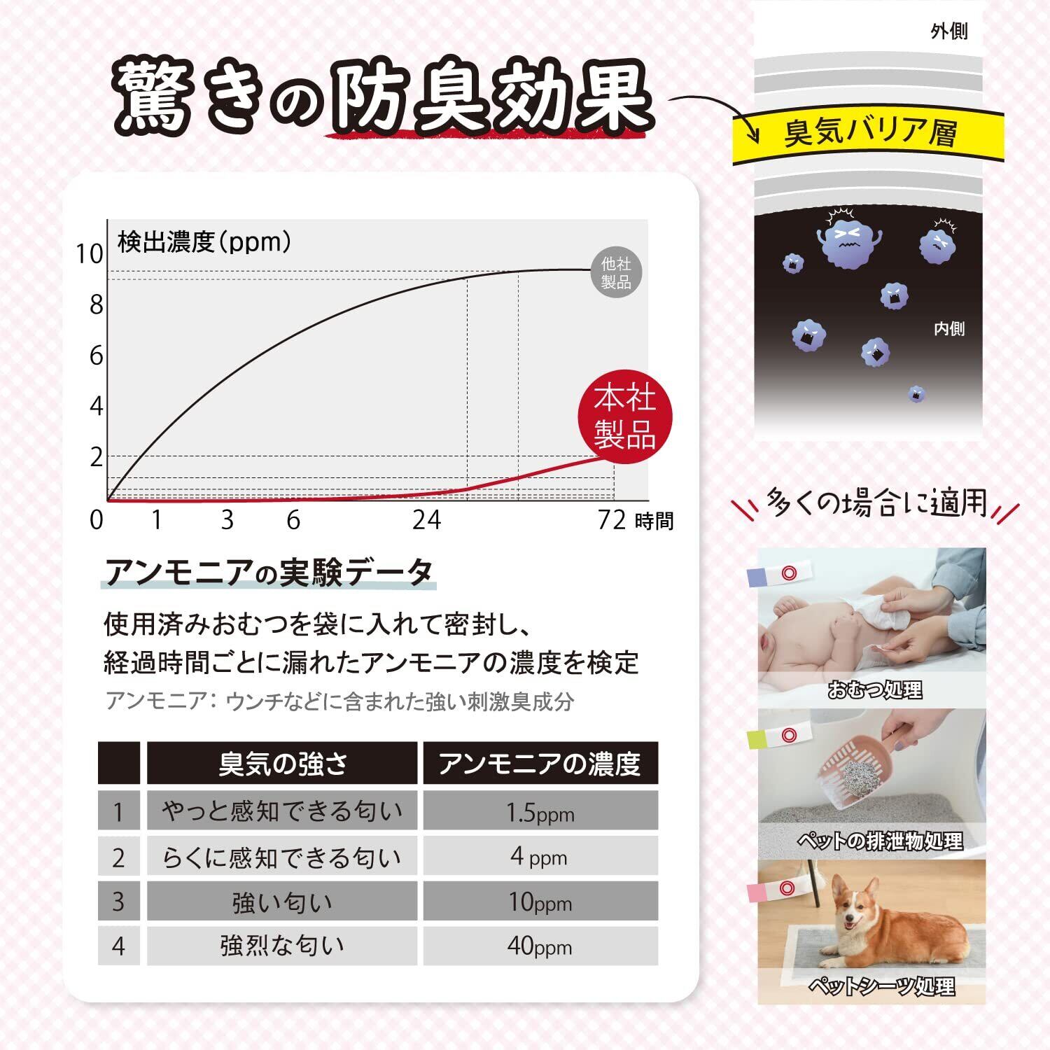 【7層防臭】共押出し法により7層フィルムが作製され、気になるニオイをしっかりとブロックします。子供のオムツ処理やペットの汚物始末など、様々なシーンで大活躍。