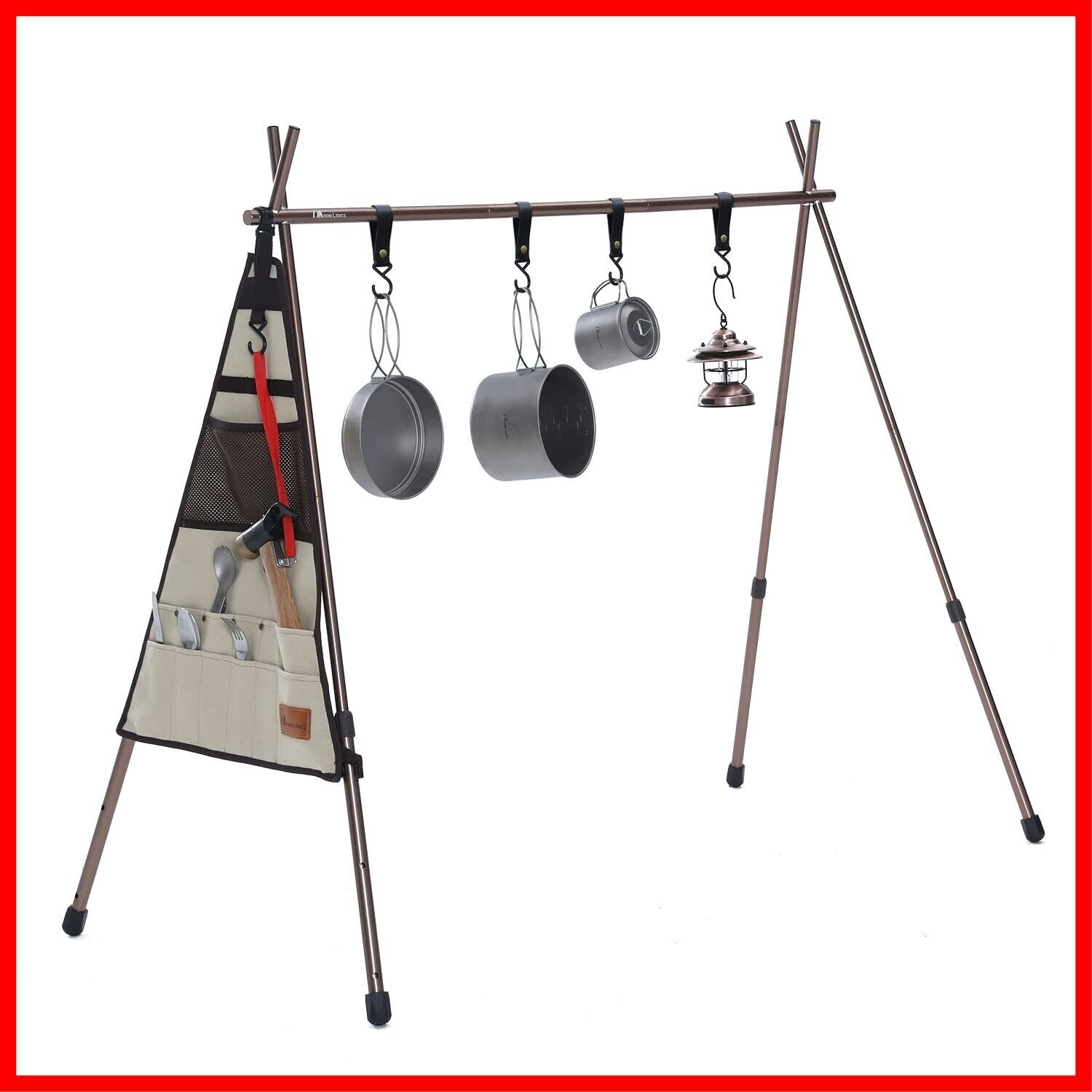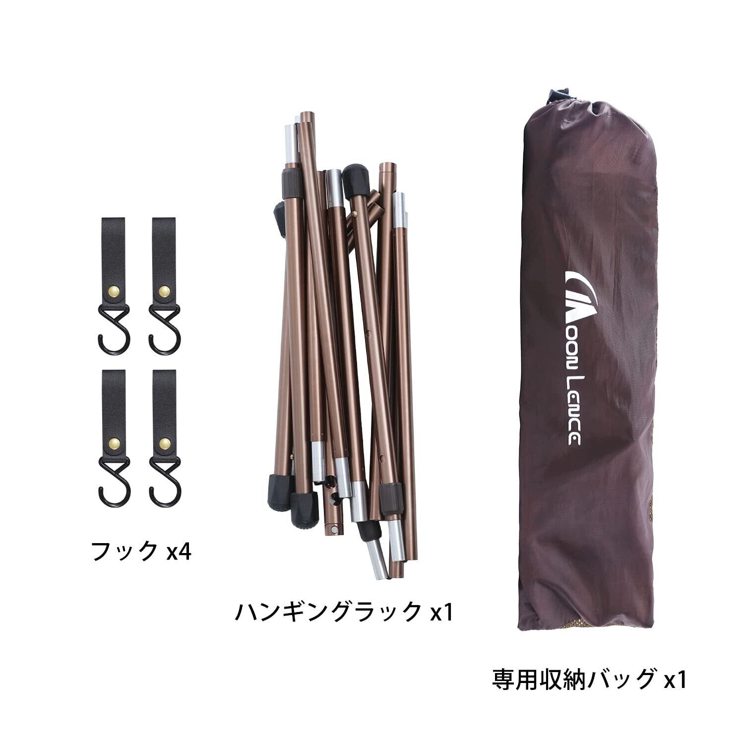 【多場合適用・部品完備】 可動フックが付き、ハンガーラックとして衣服・雨具をかけて、小物を収納するのにとても重宝して、タープや寝袋などをぶら下げて干すのにも快適になります。ランタンハンガー・ランタンスタンドとしてはもちろん、焚き火周りの小物を引掛けておく、薪割のツールを引掛けておくと、火加減の管理などに便利で、調理器具などのキャンプギアを吊るしておけば便利です。室内でも適用、何でも引っ掛ける事で快適になります。