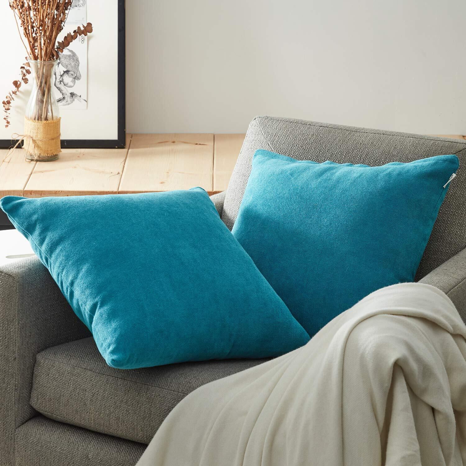 Topfinel クッションカバー リネンっぽい 60X60CM 北欧 おしゃれ 綿麻 無地 ソファ背当て 装飾枕カバー 座布団カバー ブルー 2枚(全19色)