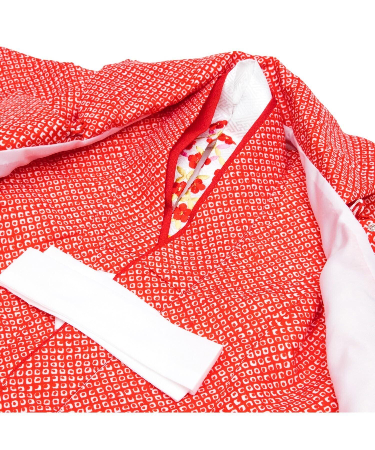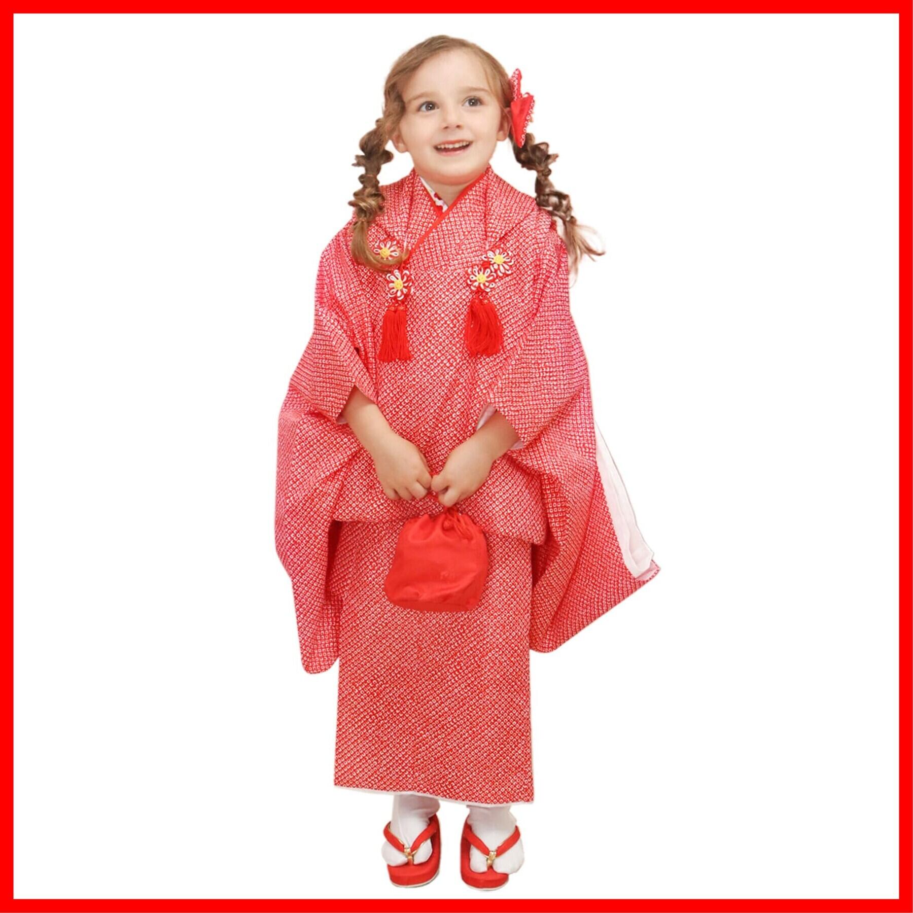 七五三のお参りにぴったり。3歳女の子の被布セットです。髪飾りや巾着、草履など含めて9点のフルセットなので、これだけで必要なものがすべて揃います。はじめての方でも簡単にできる着付けの説明書をお付けいたします。