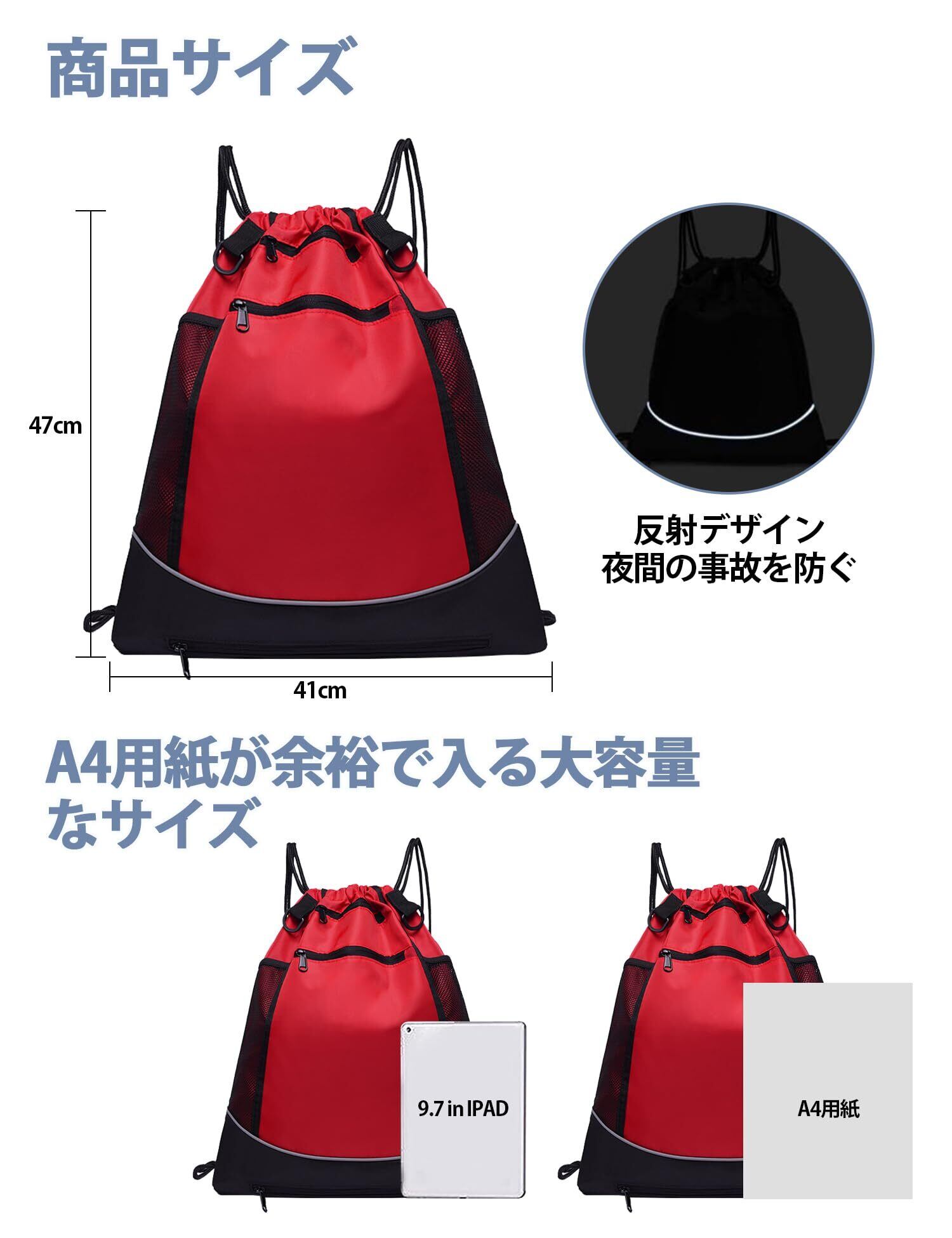 【商品仕様】:リュック:縦47cm×横41cm。メッシュ袋:縦45cm×横38cm。 色:レッド。重量:約0.35KG。本体素材:ポリエステル。