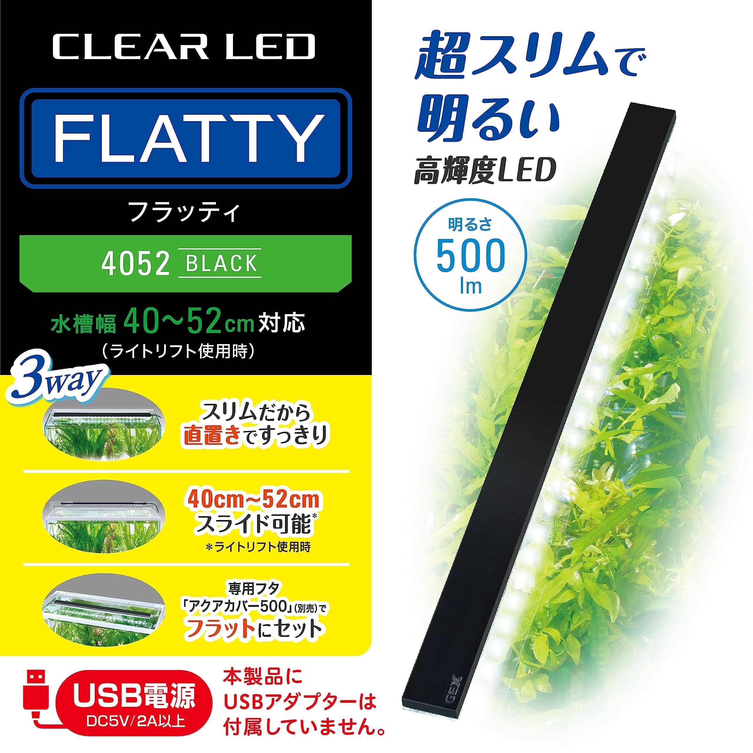 超スリムで明るい高輝度LED。置き方自由自在!フレームレス水槽にもすっきり置ける。ライトリフトで水槽幅40-52cmまでカバー。【USBアダプターは別売です。】