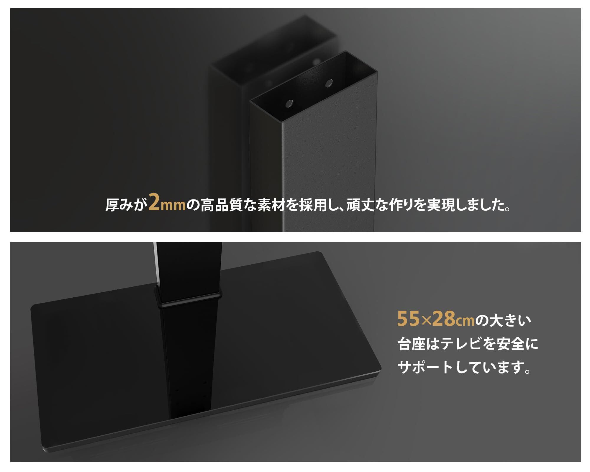 【高品質な素材】材質:厚みが2mmのブラケットと、40*80mm長方形支柱、頑丈な作りを実現しました。サイズが550*280mm、厚みが8㎜の強化ガラス製台座はテレビを安定にサポートしています。