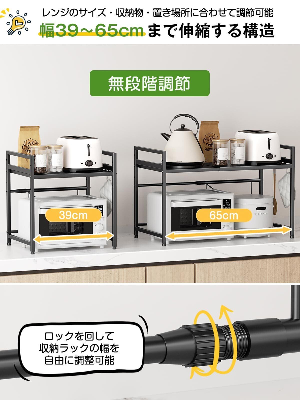 TKUIN レンジ上ラック キッチン 伸縮式 トースターラック 幅(39-65cm) 伸縮可 オーブンレンジ 棚板高さ調節可 電子レンジ台 収納 耐荷重50kg フック4つ付き 組み立て簡単 おしゃれ (ブラック)