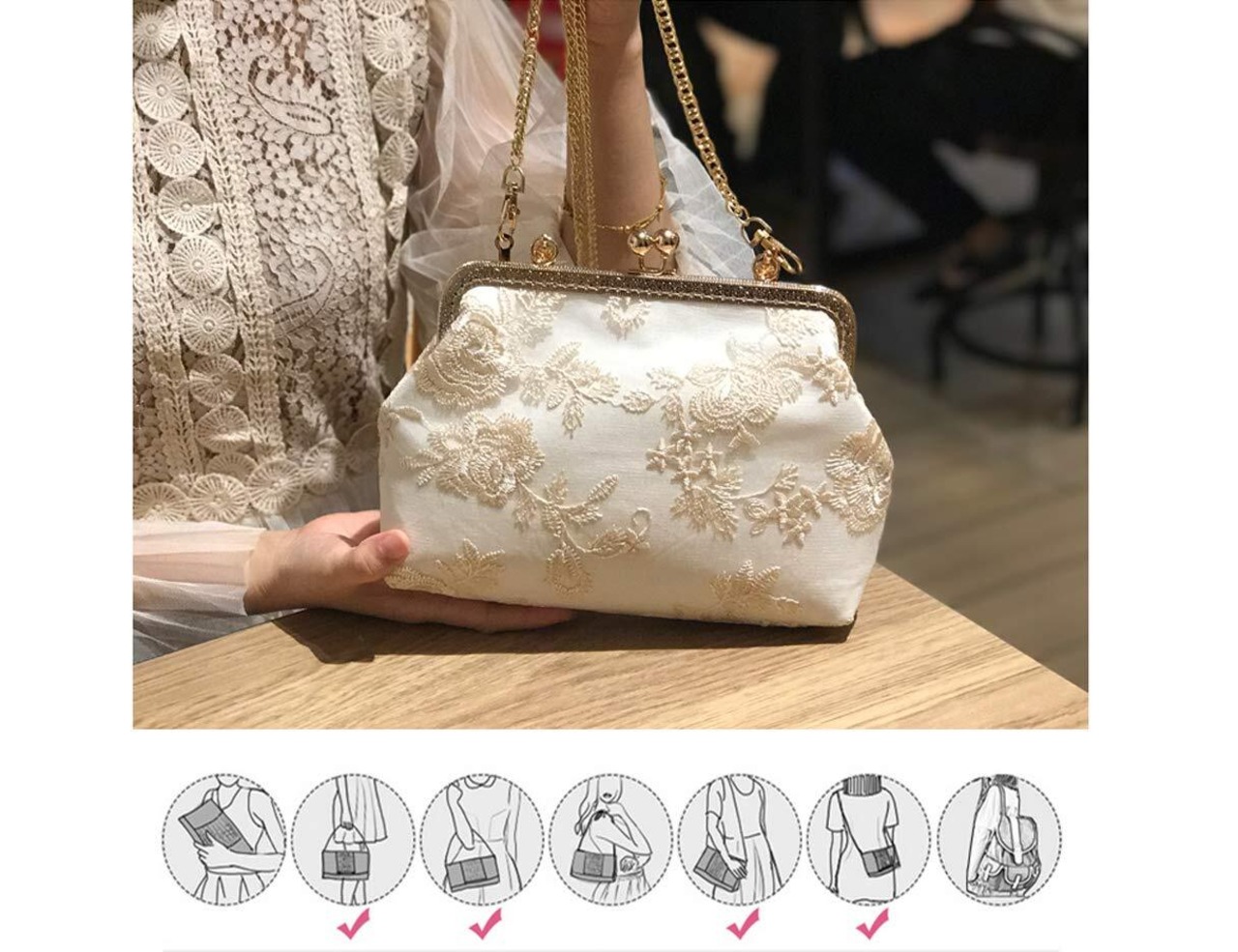 【材質】高級レース付きのデザイン、上品で多様な場面で使えるクラッチバック。パーティーシーンなどの場面で大活躍!