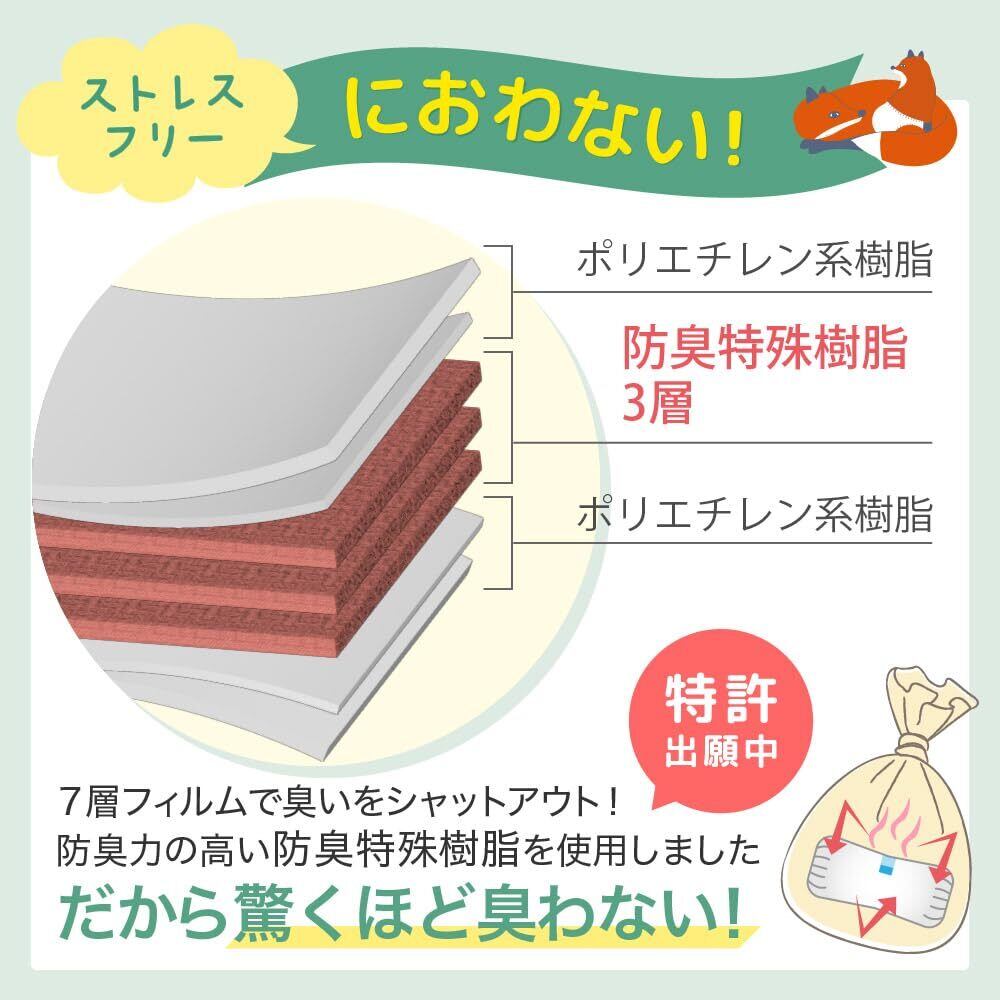 【7層フィルムで抜群の防臭力】 特殊な7層フィルムの力でしっかり防臭高機能素材を用いた多層フィルム構造により、臭いを閉じ込めます。臭いを消す(消臭)のではなく臭いを遮断(防臭)します。離乳食が始まったあとのおむつの臭いってきになりますよね、、、おむつをケラッタの臭わない袋に入れて捨てれば臭い漏れせずしっかり防臭します。出先でおむつ替えした際に出る使用済みのおむつも、すぐにケラッタの臭わない袋に入れて口をしっかり結べばもう臭いません。そのままバックに入れて家までOK。臭わないので安心して外出できます。