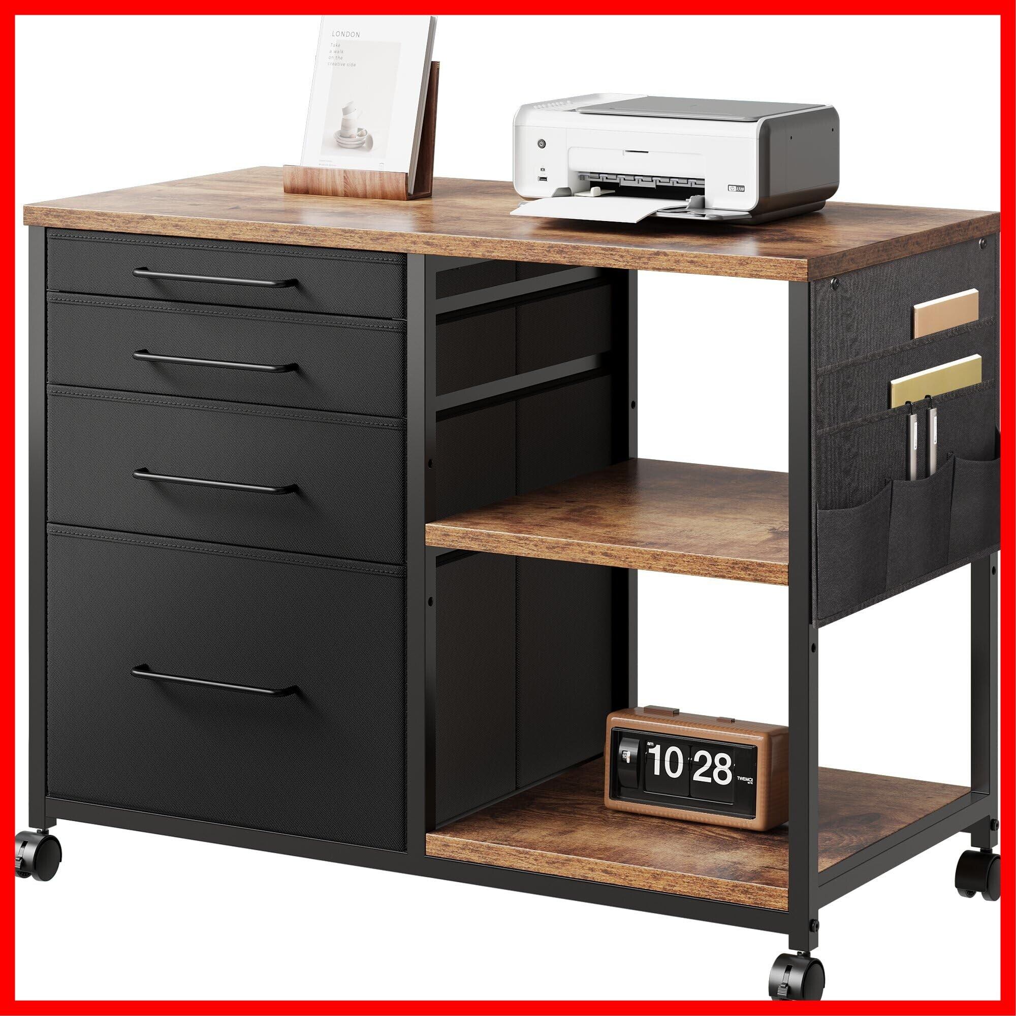 YeTom サイドキャビネット デスクワゴン 樹脂 布製 袖机 層板付き 4段 オフィスワゴン A4対応 プリンター台 大容量 キャスター付き デスク下収納 幅750*奥行400*高さ650mm ビンテージ+黒い引き出し