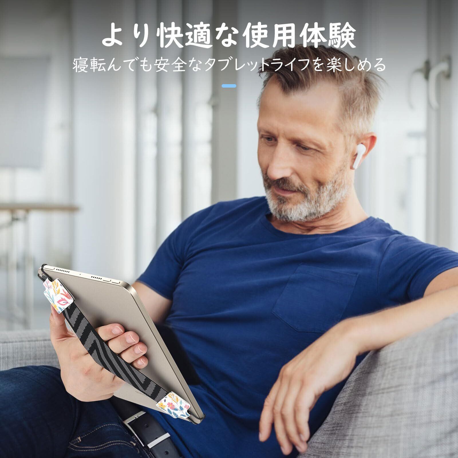 「片手持ち便利アイテム」 長時間タブレットを持っていると重く感じて手が疲れますが、このアイテムがあれば、タブレットの重量を手の全体、更に手首まで分散でき、より快適にタブレットを使えます。使用中手の疲れを分散でき、うっかりして落下するリスクも防げます。