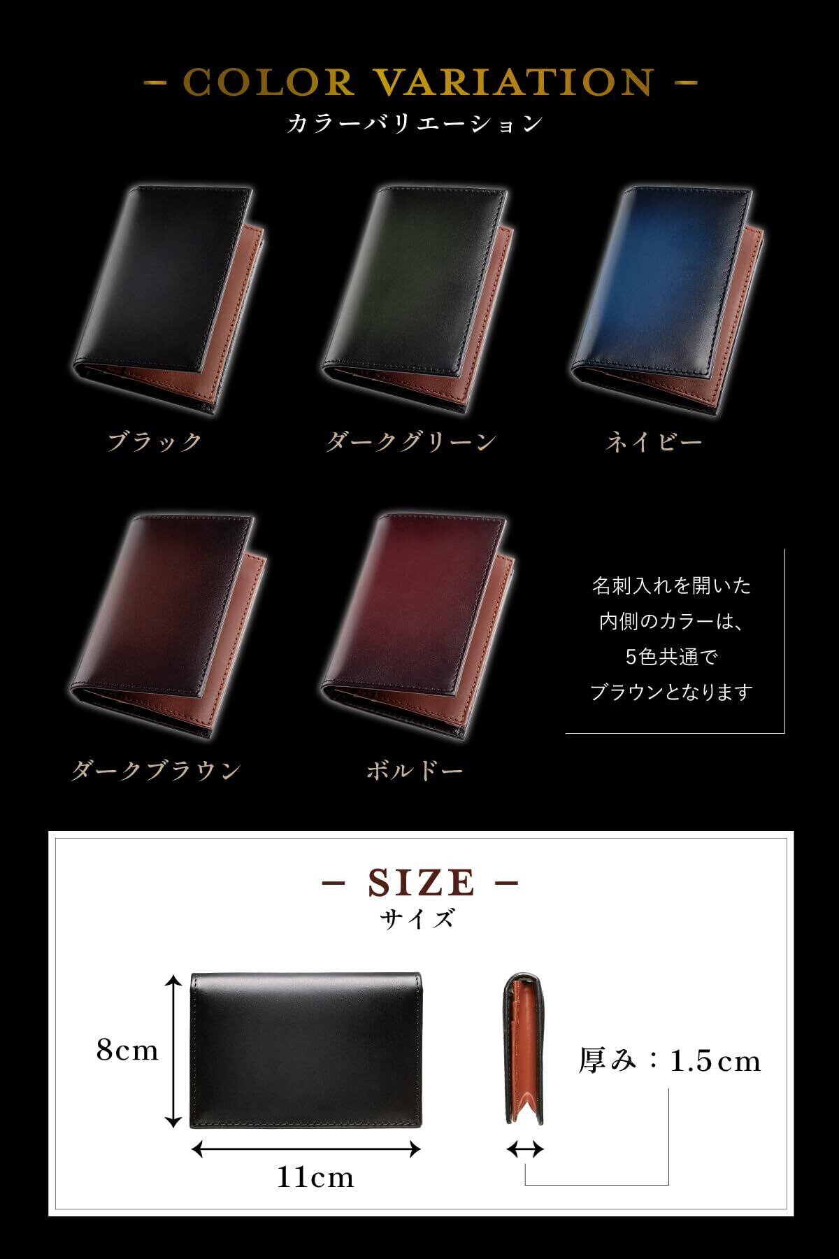 【商品詳細】◆サイズ:11cm×8cm×1.5cm ◆カラー:(1)ブラック(2)ダークグリーン(3)ネイビー(4)ダークブラウン(5)ボルドー※名刺入れを開いた内側のカラーは5色共通でブラウンとなります ◆用途:名刺入れ、カード入れ ◆ブランド名:東京下町工房 ◆万が一、商品不良があった場合、ご購入後30日以内に限り返品・返金対応いたします。お気軽にご連絡くださいませ。