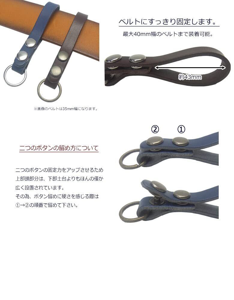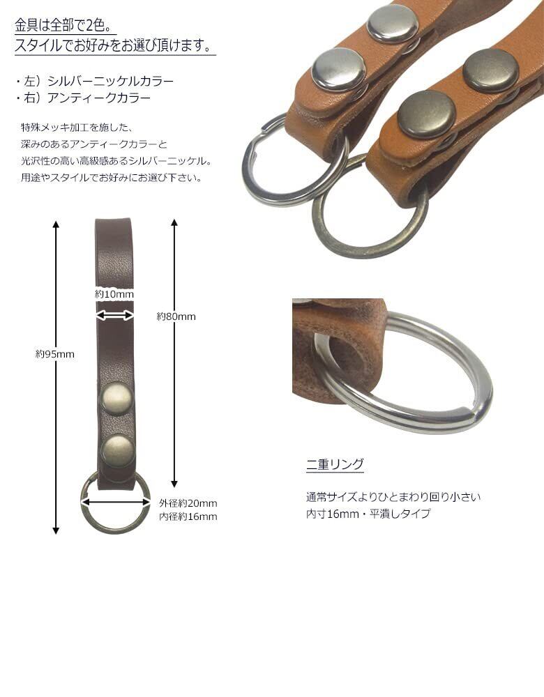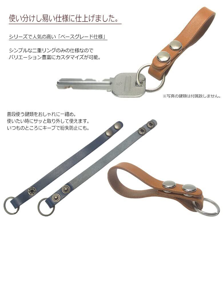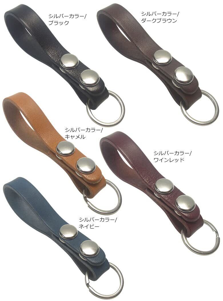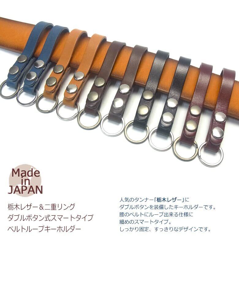 栃木レザー仕様 ダブルボタンのスタンダードなベースグレード仕様。シンプルタイプのスリムデザイン、ベルトループキーホルダーです。上質なツヤのある革に上品で高級な金具がポイント。デザインと機能性を考えて作られた職人が一つ一つ丁寧に作った国産品です。 仕様・詳細 ◆本体サイズ 全長約95mm×幅約20mm ◆素材・成分 ・革部分 牛革(栃木レザー) ・金具部分 鉄、亜鉛合金、ステンレス ◆原産国:日本 ◆仕様 ・二重リング×1 ◆注意点 ・金属アレルギーのある人はご使用に注意して下さい。 ・画像撮影時の光量具合により、現物と若干色合いが異なる場合がございます。予めご了承下さい。