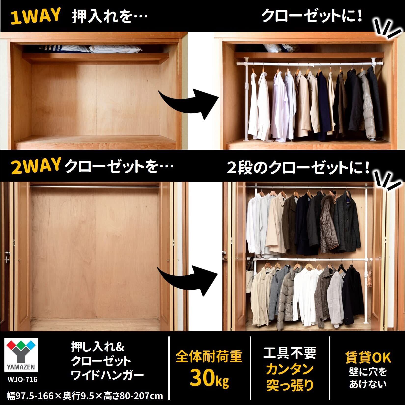 【押入れ/クローゼットどちらでも使える! 】山善で人気のハンガーラックから、押入れ・クローゼットどちらでも使えるタイプが登場! 押入れをクローゼットのように、あるいはクローゼットをダブルクローゼットにすることができます。