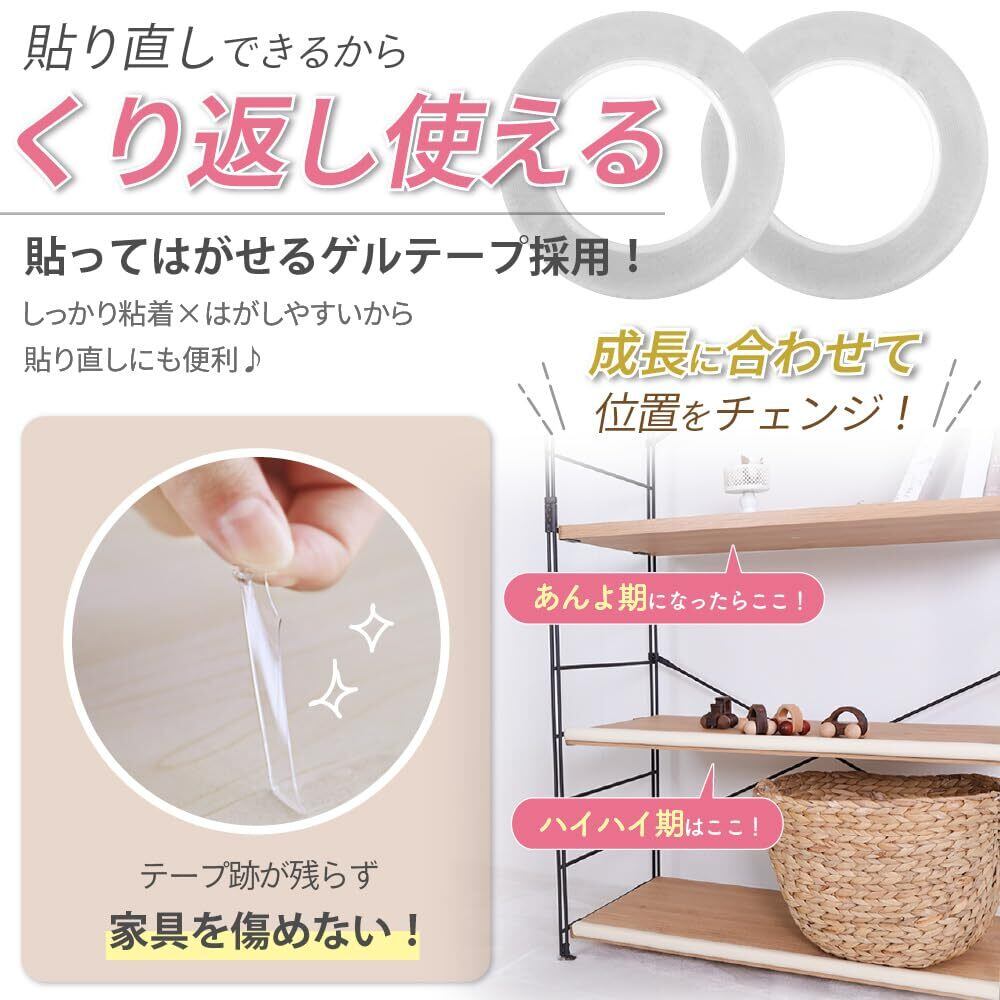 【貼り直して繰り返し使える】付属のゲルテープは粘着力が衰えにくいから貼り直しができる!貼るときに失敗しちゃったり、「やっぱりこの高さに貼り直したい」と思った時にムダなく繰り返し使えるのが嬉しいまた、従来の両面テープのようにテープの跡が残らないから大切な家具を傷めません。※壁紙やペンキ塗装部は剥がれる恐れがありますのでご使用をお控えください。