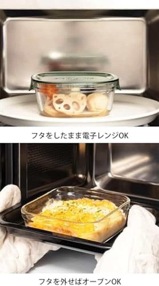 電子レンジ:OK (フタをしたまま)、オーブン:OK (フタを外せば)、食洗機:OK、直火不可