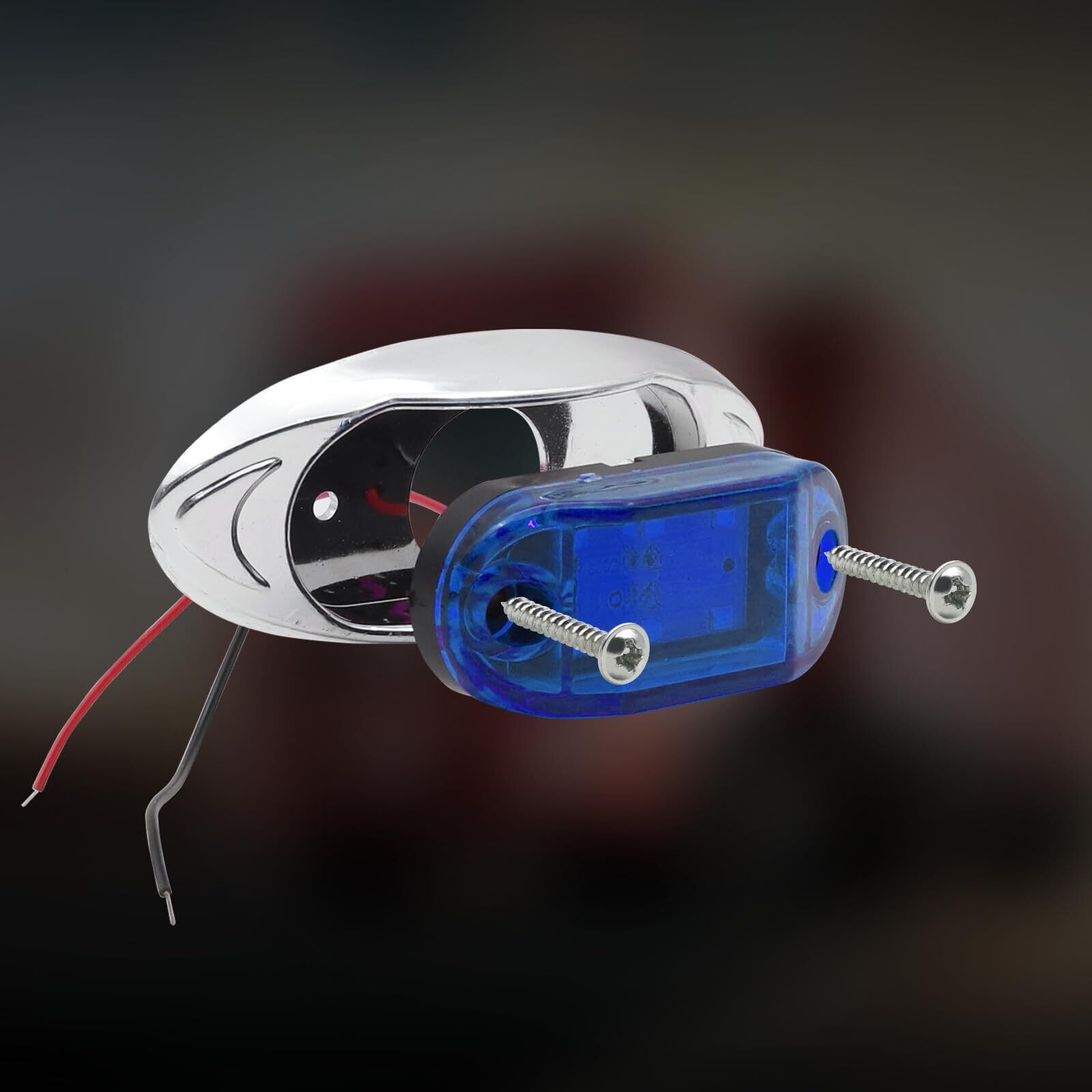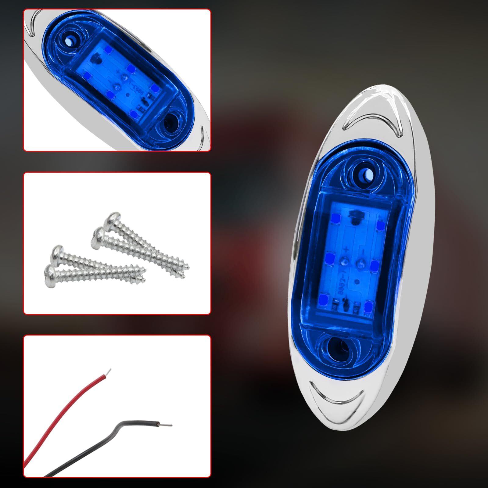 【製品詳細】サイズ(約):横 98 mm × 縦 40 mm × 奥行 20 mm レンズ幅 64 mm ネジ径 3 mm ◆発光色:青色 ◆本体色:シルバーフレームと青いレンズ ◆動作電圧:12V 24V ◆材質:ABS樹脂ボディー+メッキフレーム+6連LED ◆2本配線:“+”が赤い線、“-”が黒い線 ◆入数:4個セット
