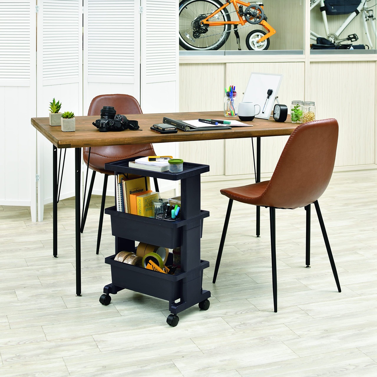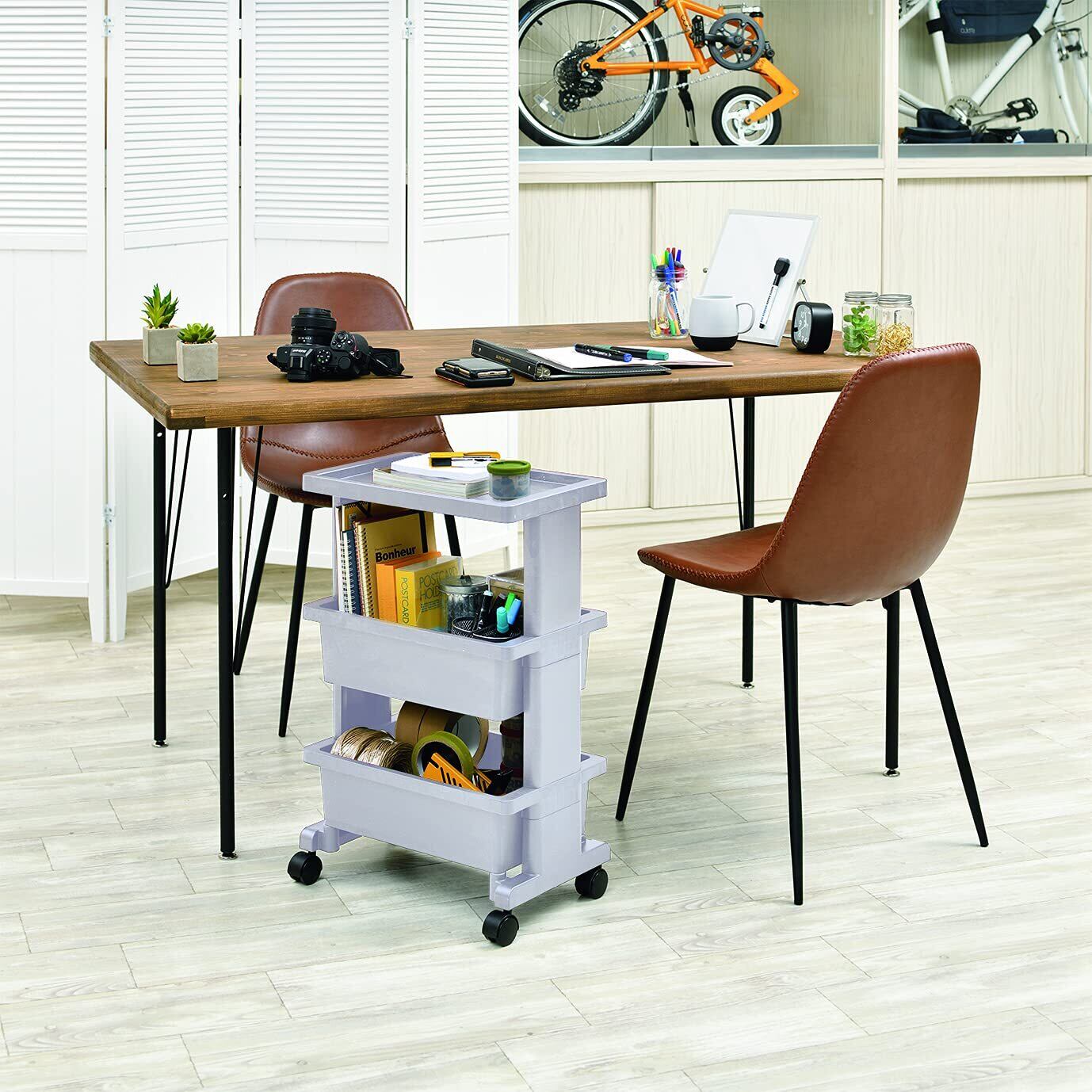 リビング・キッチン・ランドリー・子供部屋・寝室など様々な場所で活躍するキャスター付きミニワゴン。デスク下に入るミニタイプの収納テーブルワゴン。キャスター付きで移動もラクラク。工具不要の簡単組立式なので、女性でも簡単に組み立てできます。