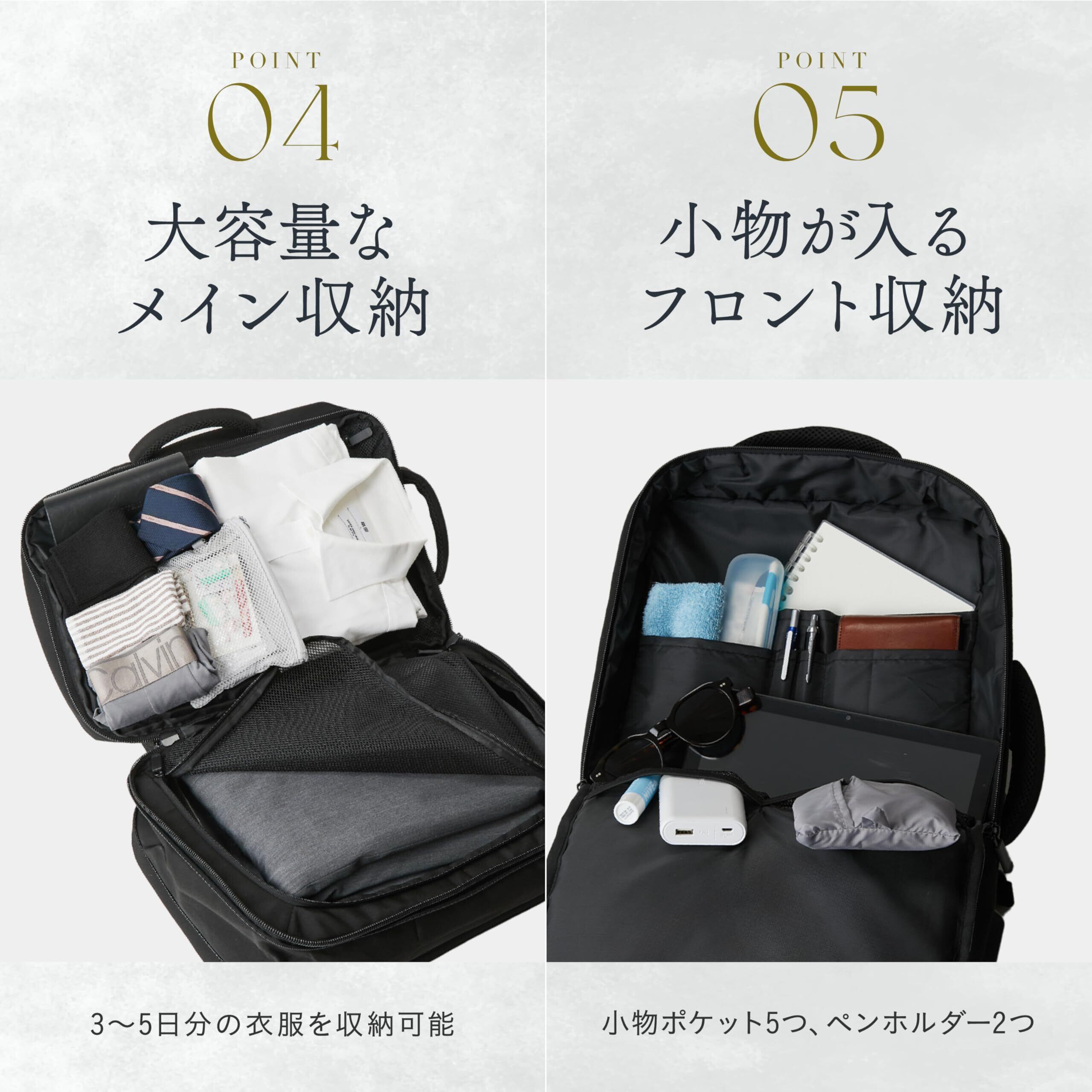 【充実の収納力と機能】 ビジネスマンの必需品に合わせた用途別ポケットが充実。 ・16インチPCまで対応可能なPCポケット(保護クッション付き) ・中には取り出しやすいフリーポケット、貴重品収納に便利なファスナー付きポケットを完備 ・前面には、必要なものをさっと取り出せるフロントポケットあり ノートPCから細かいものまで、これ1つで整理整頓が叶います。 また、マチが12.5cmから22.5cmに拡張可能なため、 荷物が多い日や出張時などもこれひとつでOK。移動を考え、機内持ち込みにも便利なキャリーオン機能を搭載。旅行などでも活躍すること間違いなしです。
