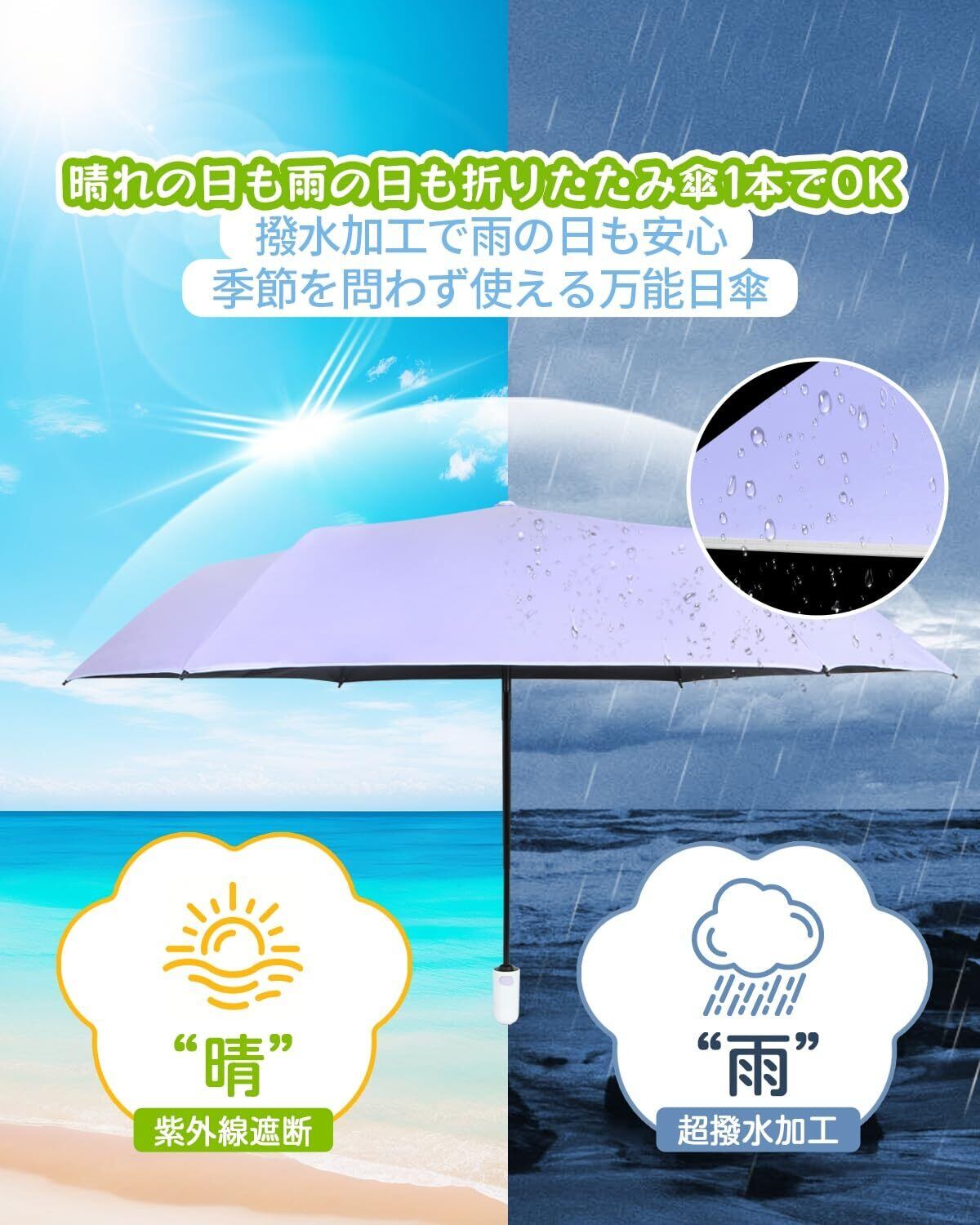【晴雨兼用でどんな天候にも対応】持ち運びに便利な日傘兼用雨傘の折り畳み傘です、高密度の防水素材を使用した日傘です。 通常の傘よりも耐水性に優れ、軽く振るだけで雨が玉のように一気に落ちるので、他の人の邪魔になることもありません。 センターポールと傘の骨は航空機用アルミニウム合金を採用しており、強度と耐久性に優れている折りたたみ軽量日傘とも言えます。ゲリラ豪雨や突風にも難なく対応できます
