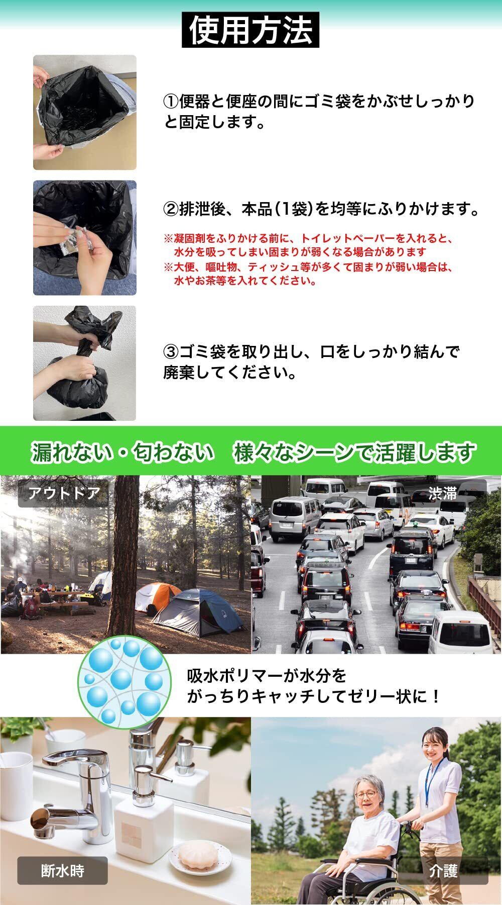 「使用方法」 1.便座を持ち上げ、便器に処理袋をセットしてください。 2.便座をおろし、ズレのないようにしっかりと処理袋を固定してください。 3.用便を足した後、個包装されている袋を破って中の凝固剤を均等にふりかけてください。 ※固まりづらい場合は水を少し足してください。 4.処理袋を取り外し、上部をしっかりと結んで廃棄してください。処理袋をしっかり結ぶことで、臭いモレも防げます。 ( ※ 処理方法については各自治体の条例に従ってください。)
