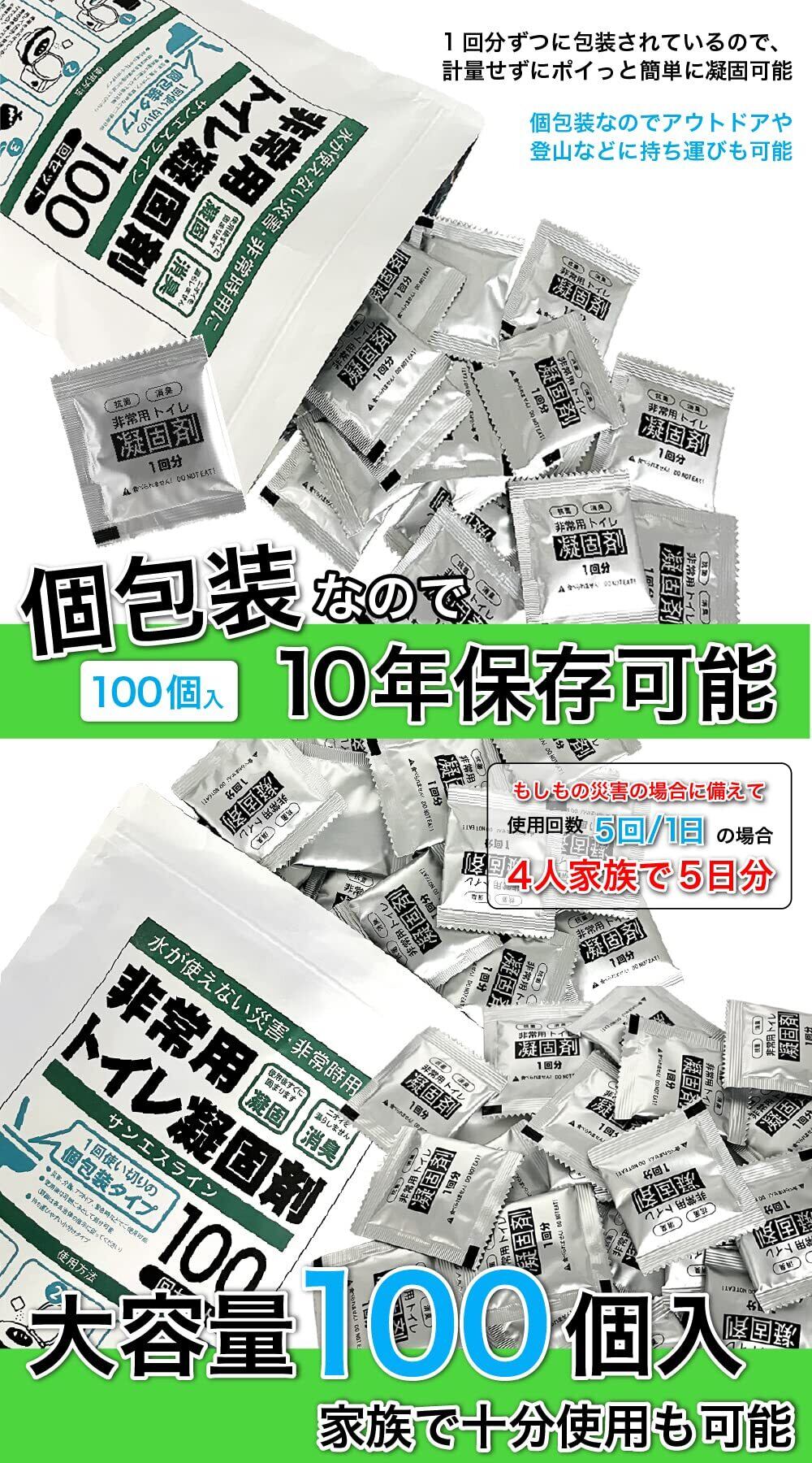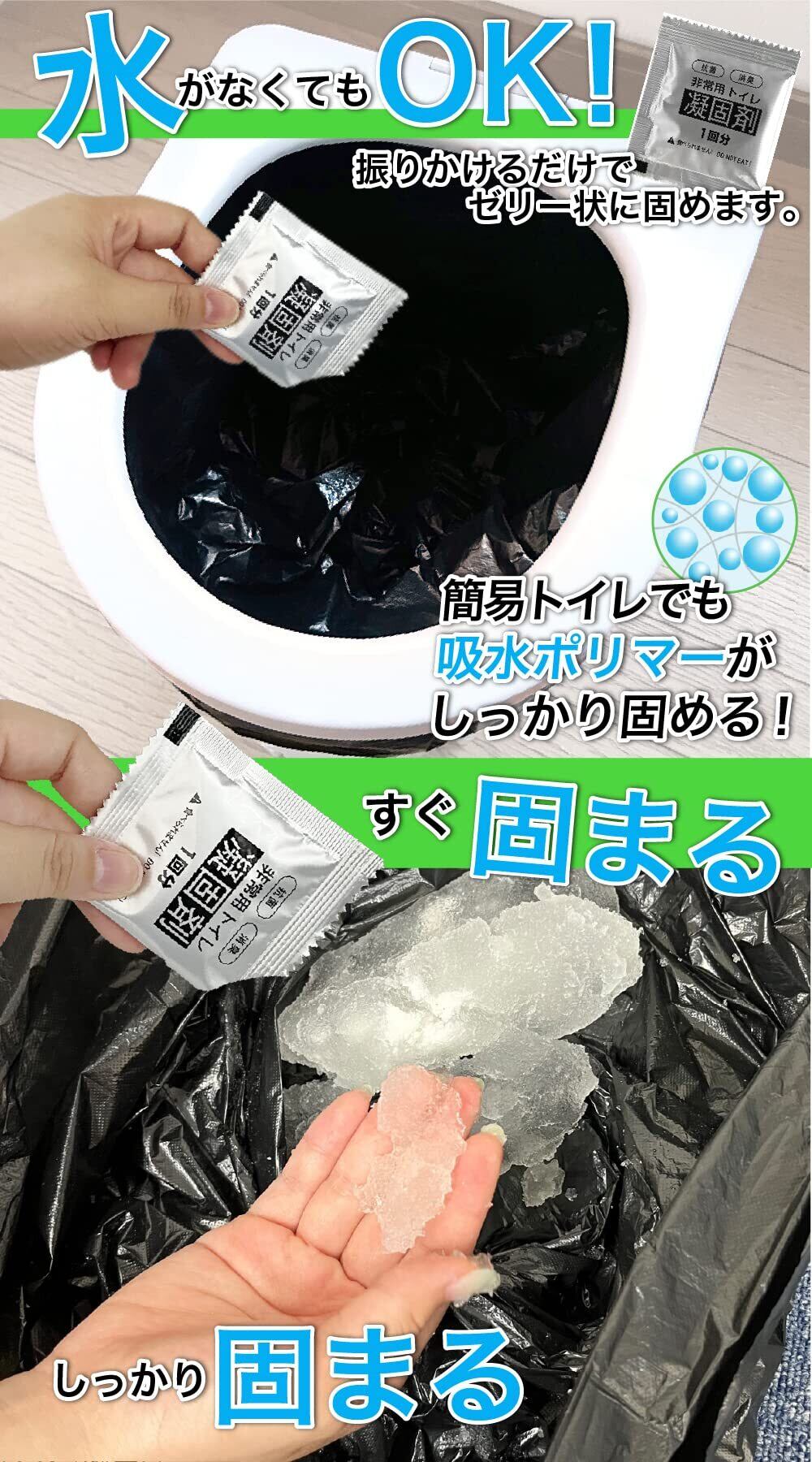 別途「処理袋」があればポータブル トイレ・簡易トイレ・洋式トイレやバケツ、段ボールにセットして使用いただけます。 安心して使える100回分セット(凝固剤100個) 凝固剤は個別包装となっており、使い切りタイプで使用が簡単! 凝固剤1袋で約600ccの水分を固めることが可能です。 水分を素早く固めるので使用後の水分モレの心配がありません。