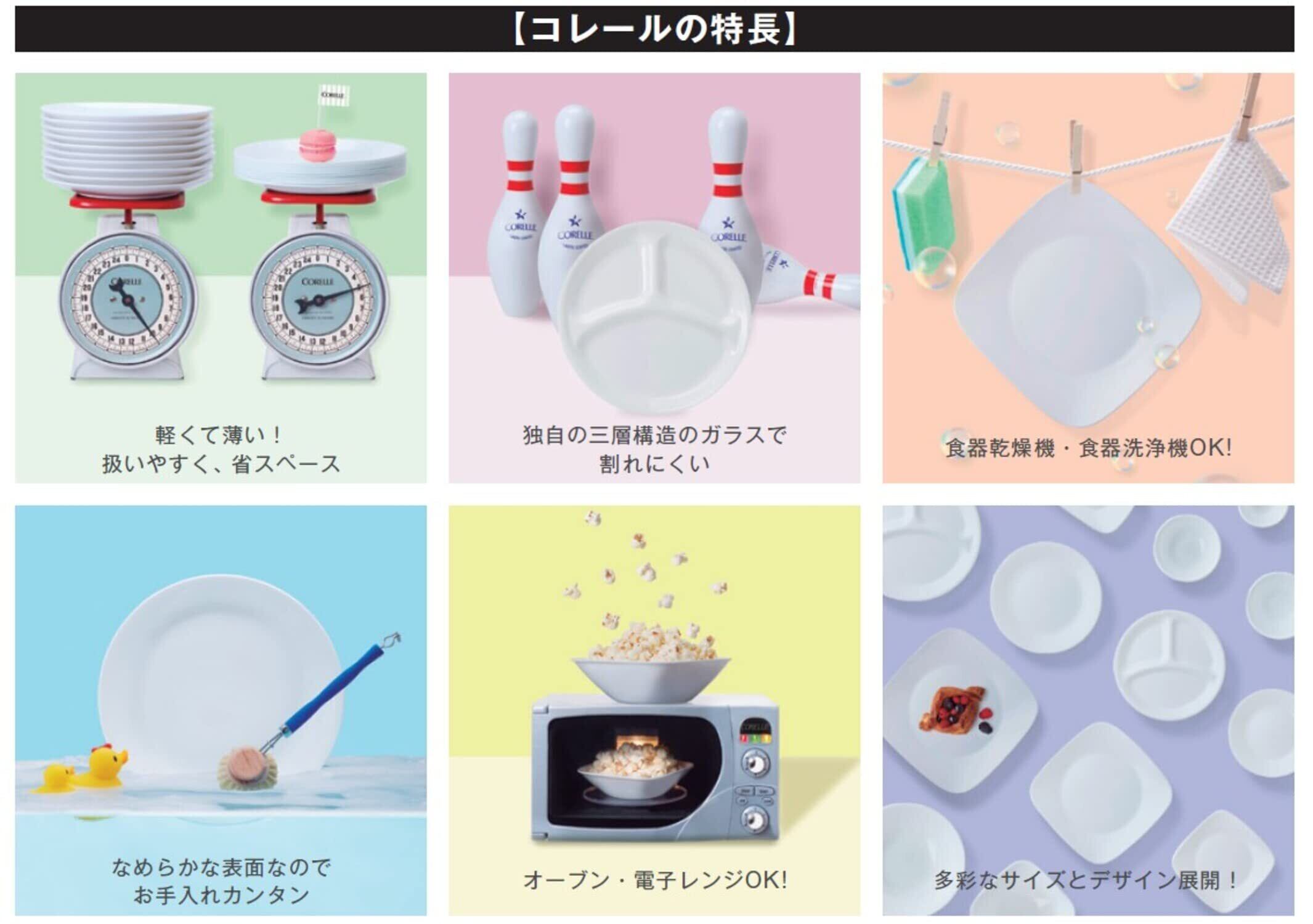 世界50か国以上のご家庭で愛用され続けている独自の三層ガラス製食器「コレール」。軽く薄くて割れにくい食器として長年愛用いただいています