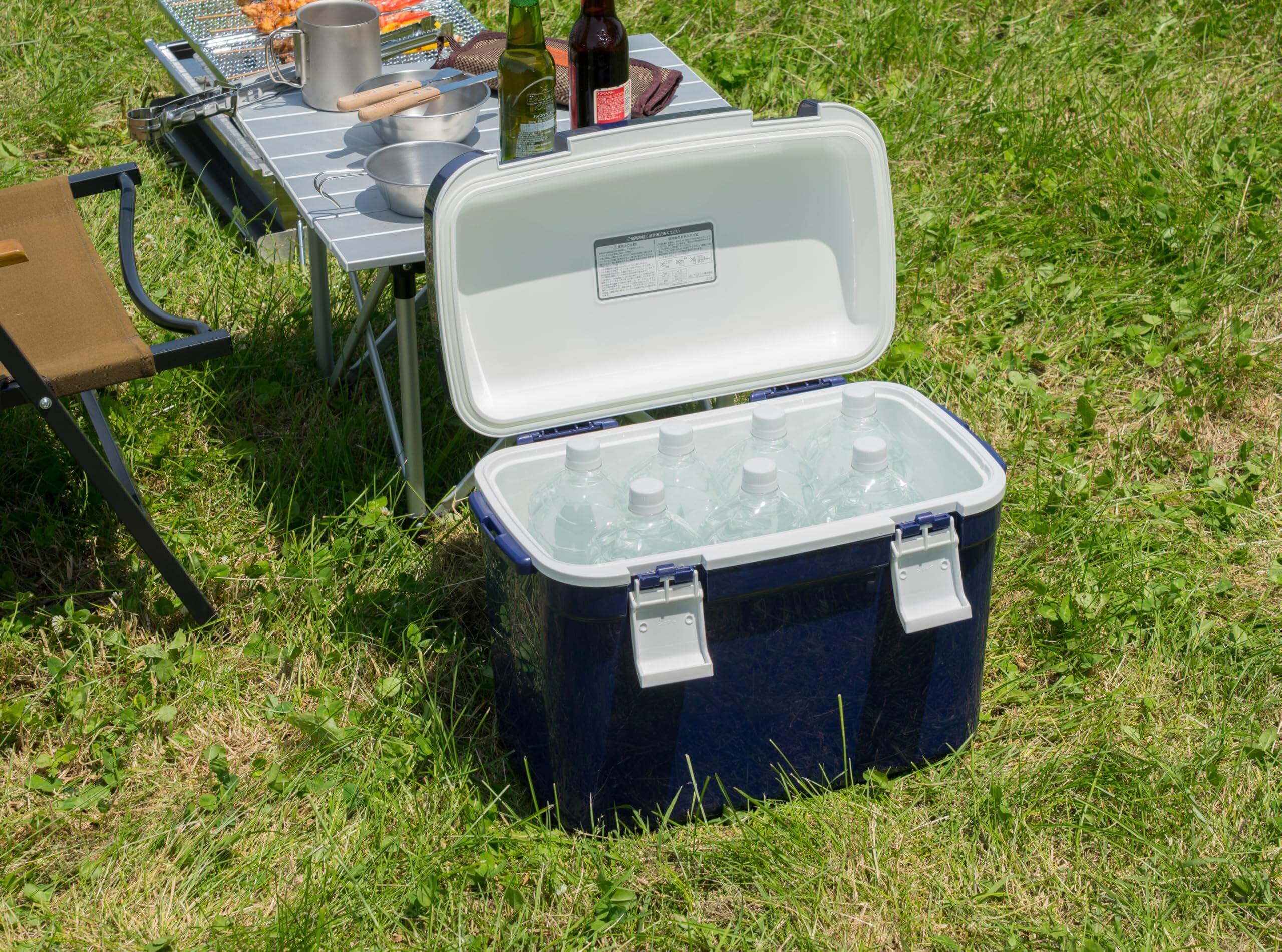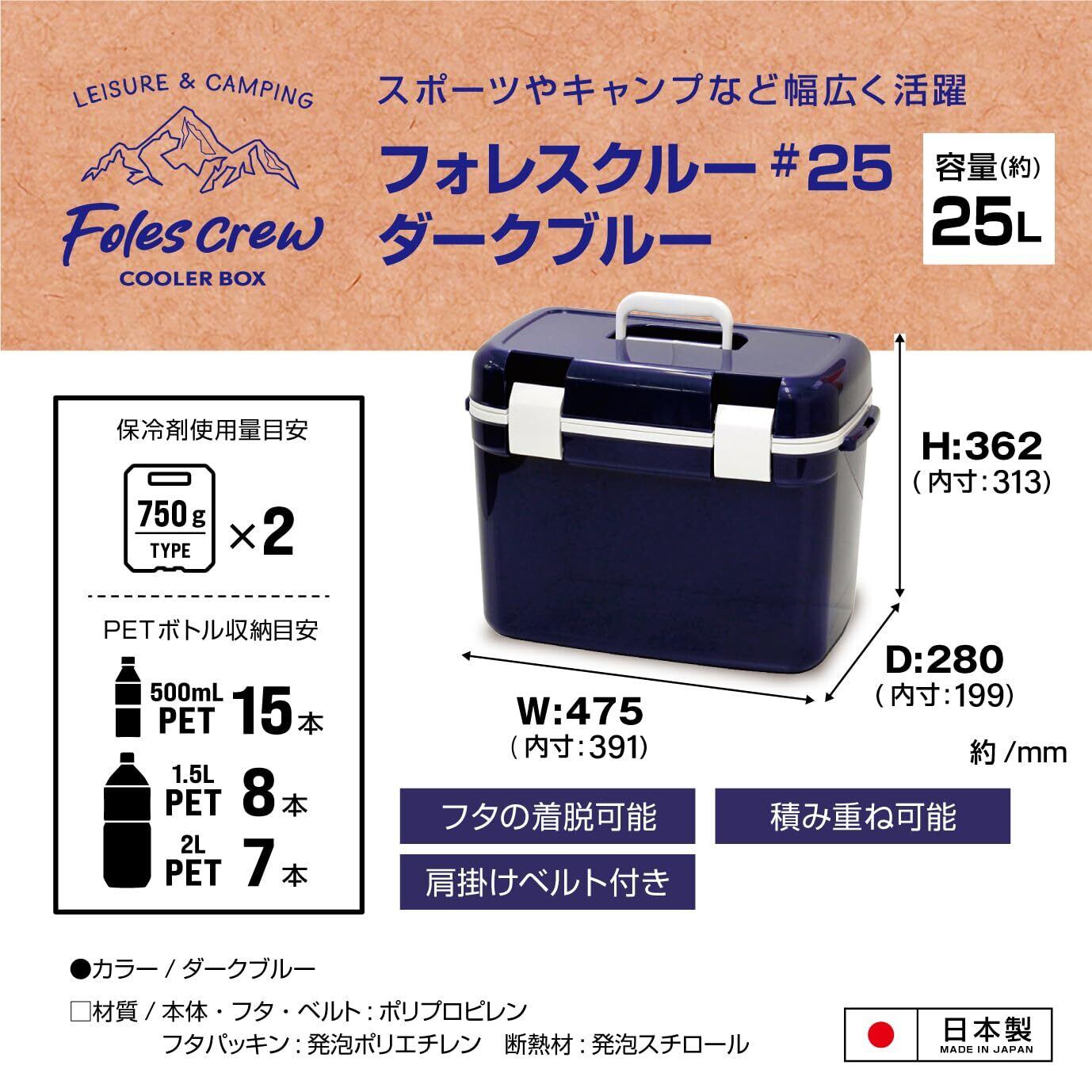 JEJアステージ フタが外せてお手入れ簡単 クーラーボックス フォレスクルー ダークブルー 25L 日本製[幅475x奥行280x高さ362㎜]肩掛けベルト付き 保冷 軽量 ランチボックス 部活 アウトドア お出かけ レジャー スポーツ 500mlペットボトル15本 ショルダーベルト付き