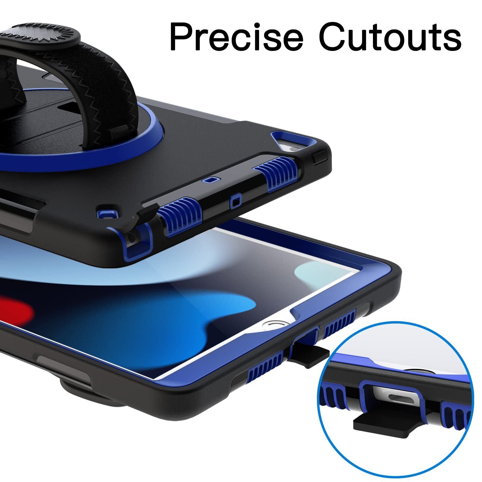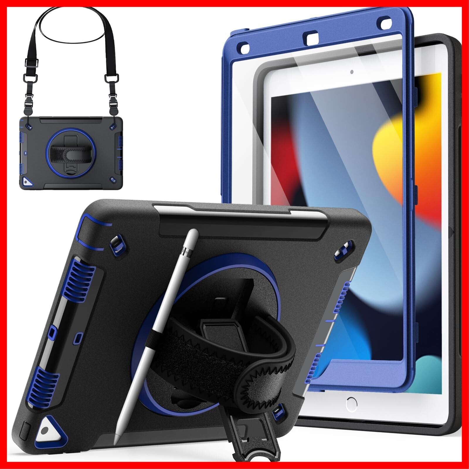 JETech iPad 10.2インチ ケース (第9/8/7世代、2021/2020/2019モデル) 液晶保護フィルム付き 保護耐衝撃頑丈なタブレットカバー 360°回転ハンドストラップスタンド (紺)