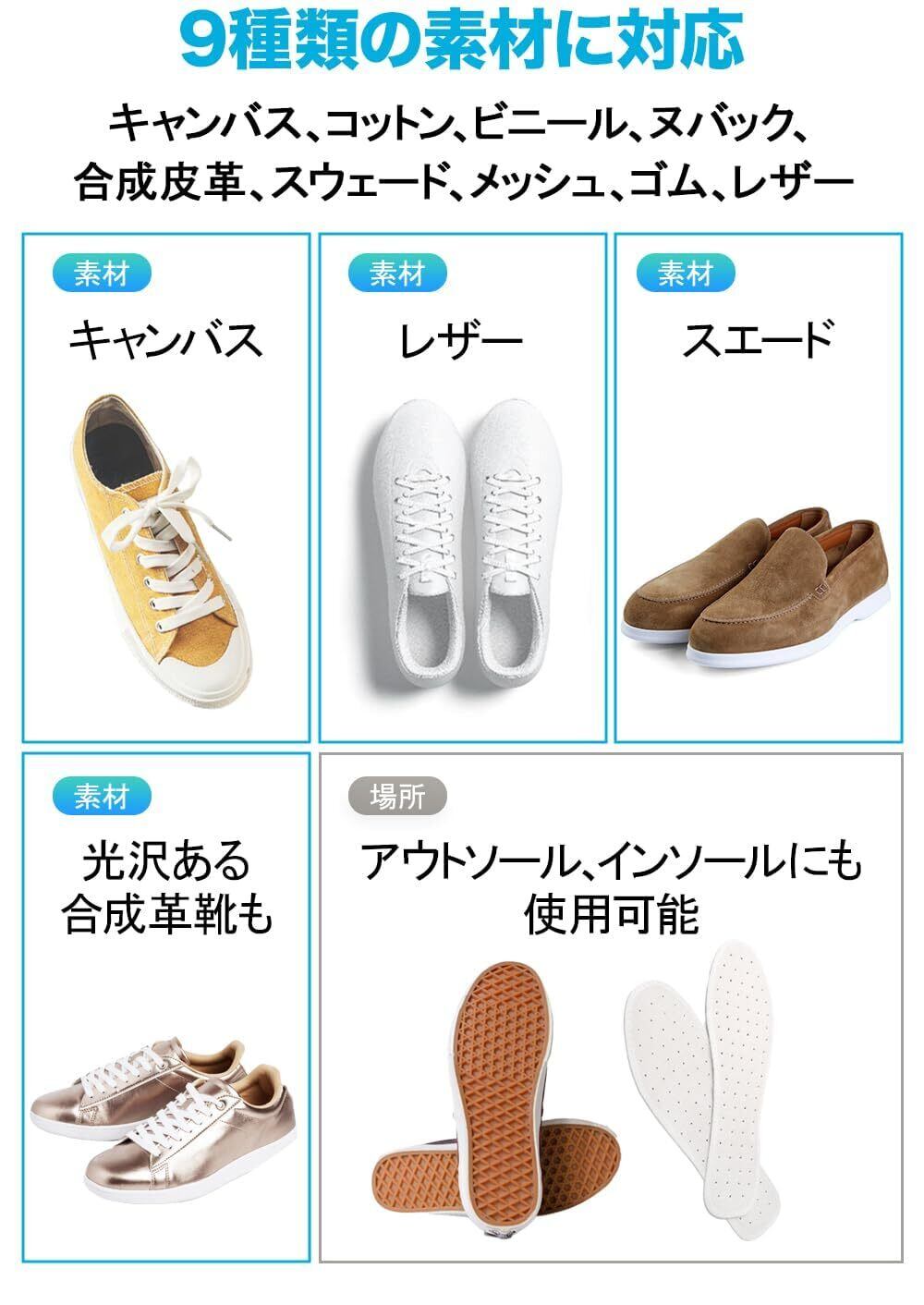 使用可能素材:キャンバス、コットン、ビニール、ヌバック、本革、合成皮革、スウェード、メッシュ、ゴム、本革、レザーなど、様々な素材に使用できます。使用上の注意をご確認下さい。