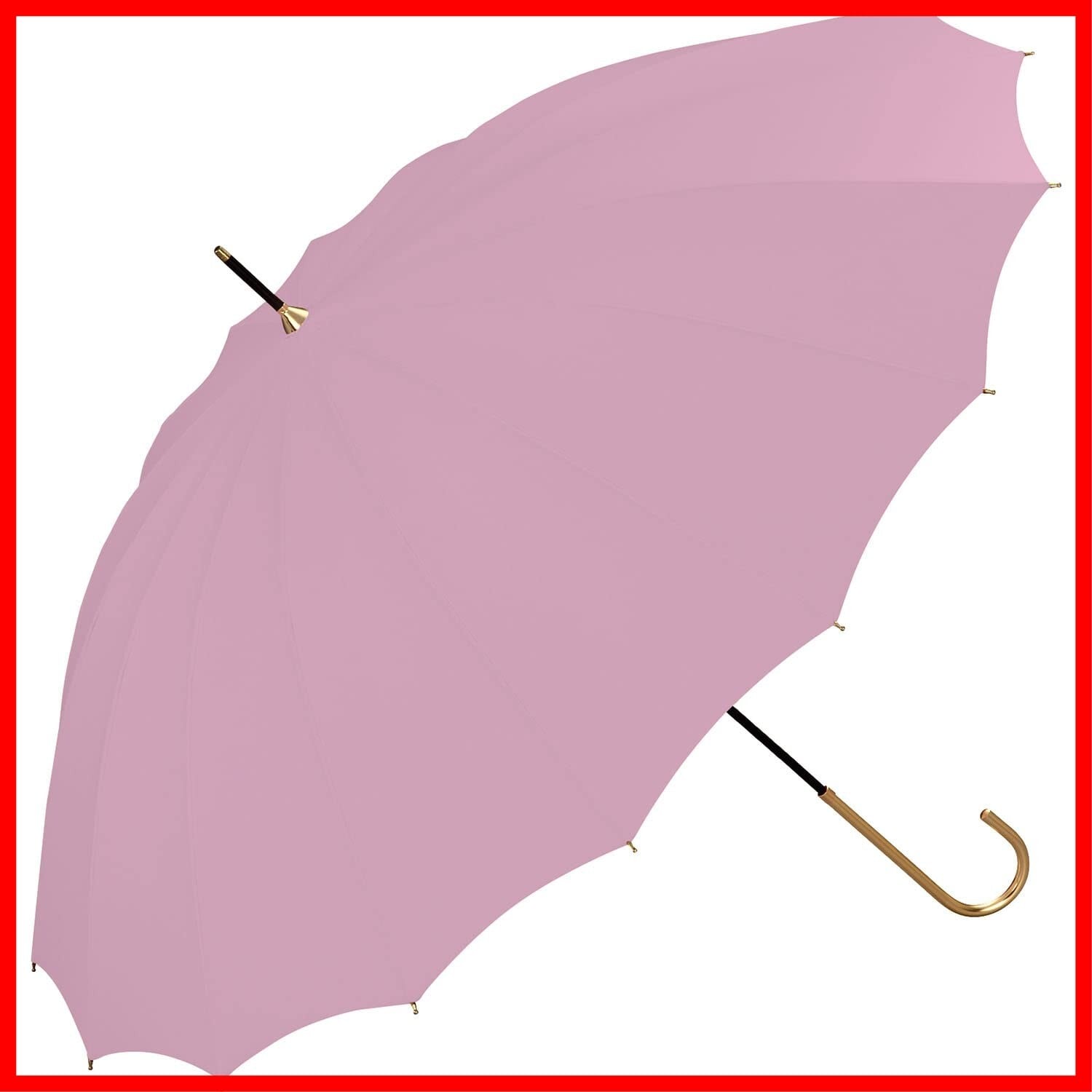 ゴールド手元を使用した、上品でシンプルな16本骨アンブレラ。 ゴールド手元を使用することで繊細かつ大人っぽい印象を演出する、丈夫な16本骨アンブレラ。 骨の数が多いため風に強く耐風性に優れていながら、グラスファイバー骨を使用することで持ち歩きやすい重さにこだわりました。