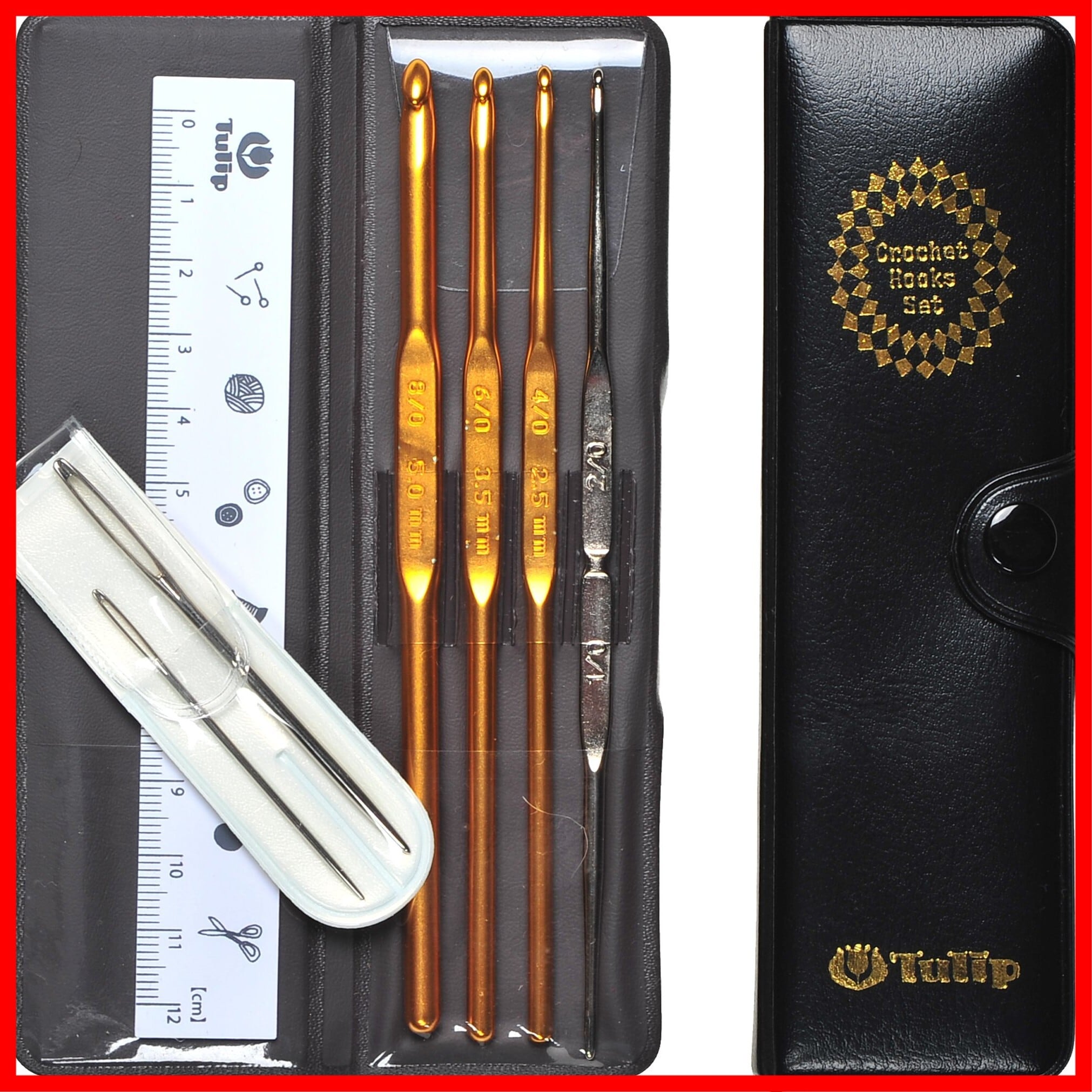セット内容:両かぎ針1/0-2/0、片かぎ針4/0、6/0、8/0号、とじ針(2サイズ)、ものさし、ケース
