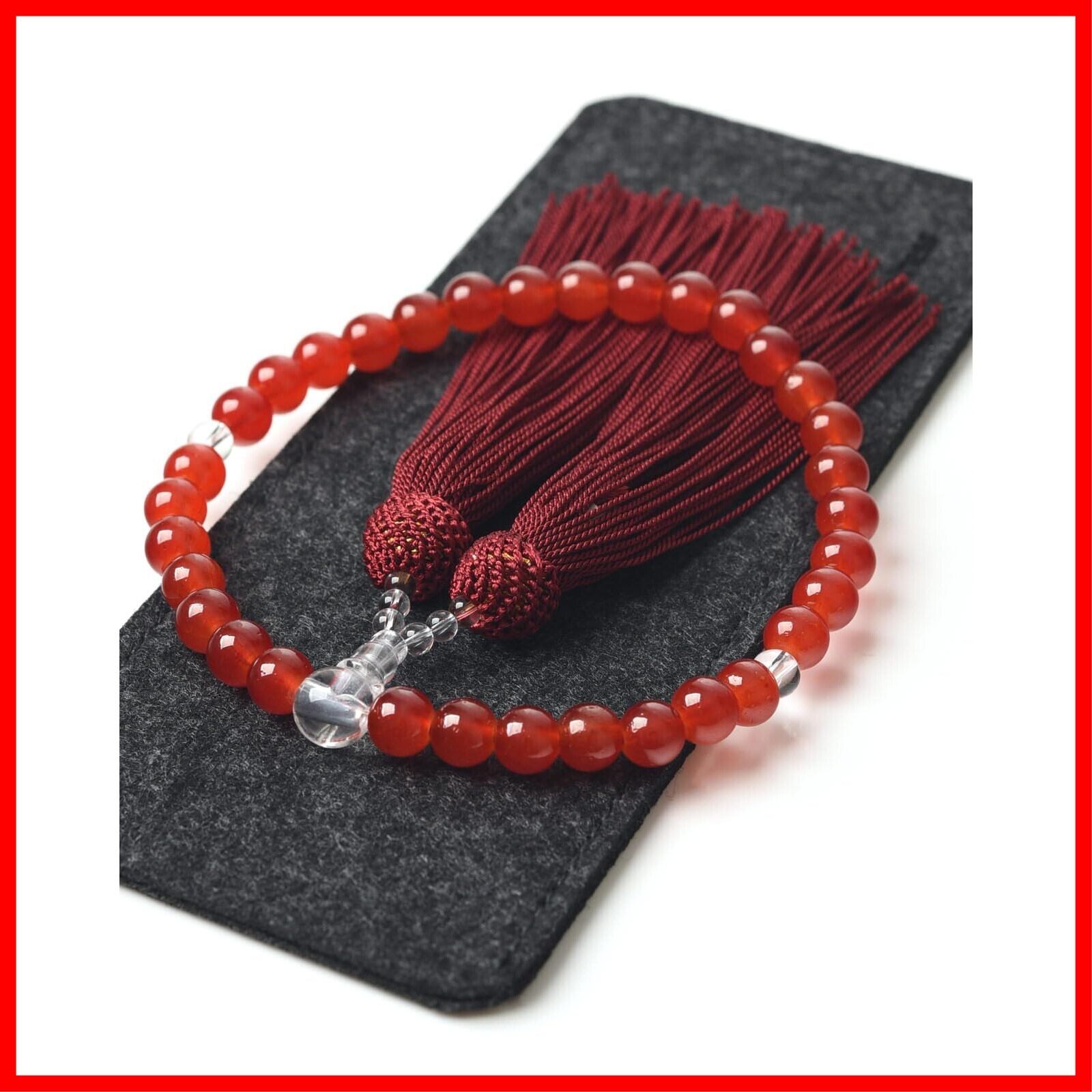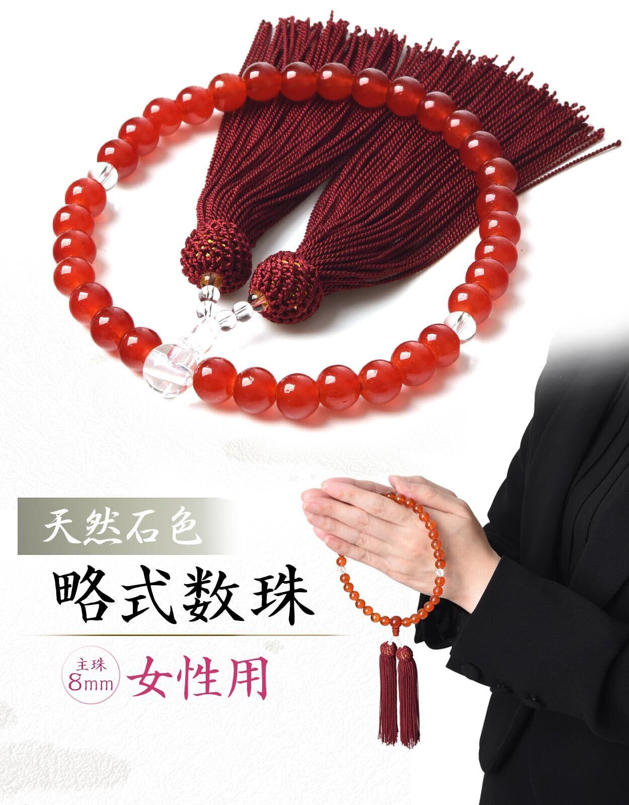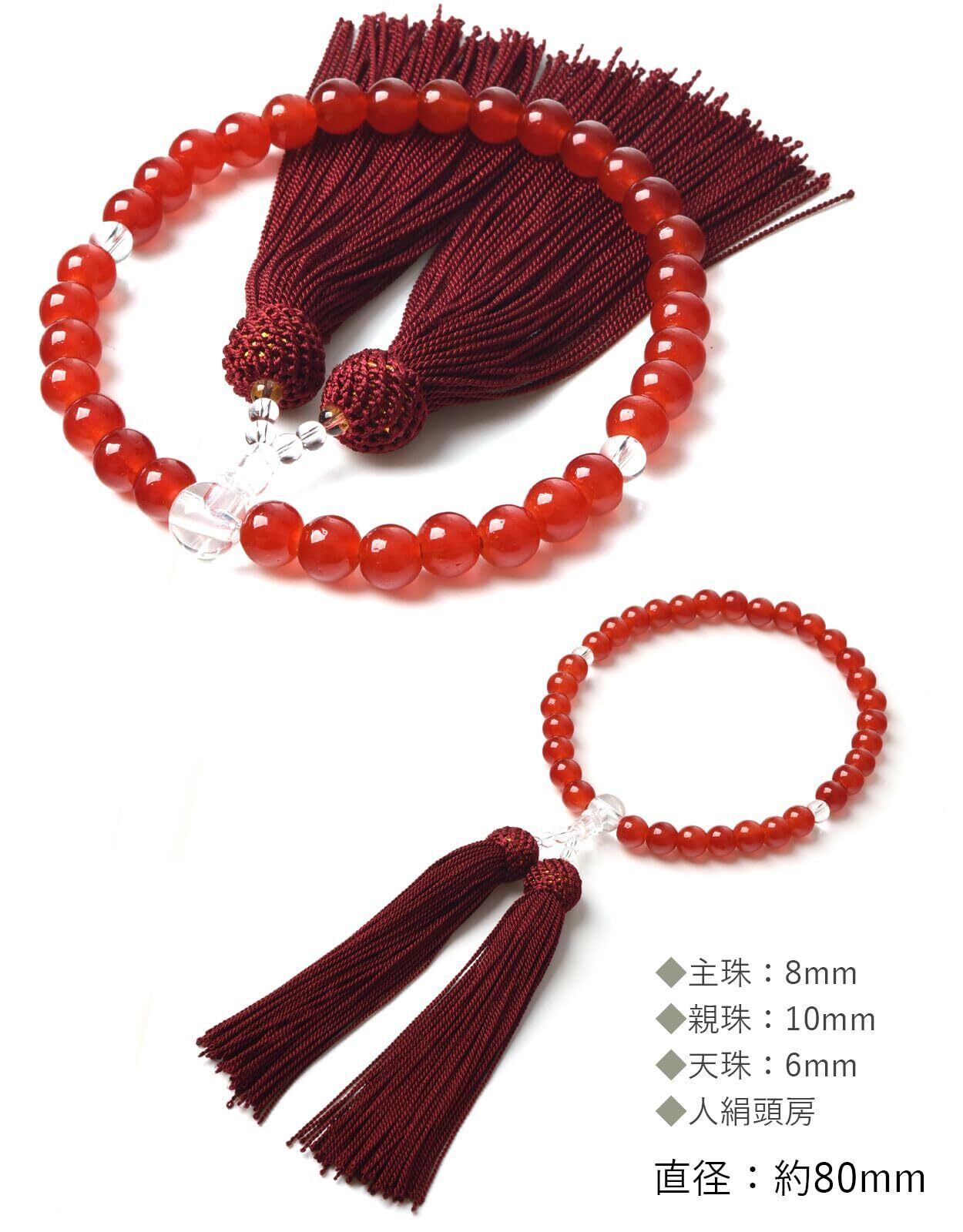【EsuonHappiness】数珠 女性用 8mm 頭房 硝子 略式数珠 すべての宗派で使える 選べるお色 法事 葬儀 数珠袋付き 天然石色 人絹房 (赤メノウ色)