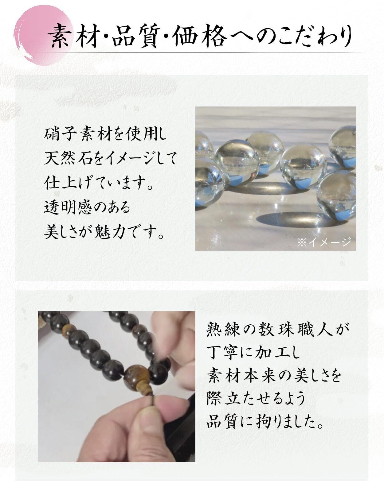 【素材へのこだわり】熟練の数珠職人が丁寧に加工し、素材本来の美しさを際立たせるよう品質に拘りました。色合いや質感がよく高級感があり、上品な雰囲気を演出してくれます。