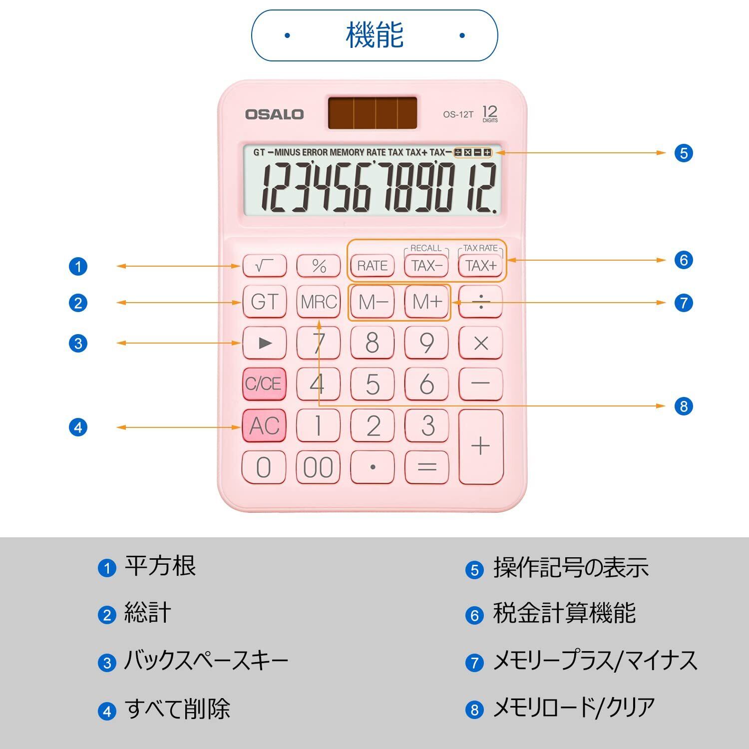卓上電卓 大型LCDディスプレイ 12桁 数字ビッグボタン 税金会計計算機 電池式 太陽光発電 デスク オフィス 自宅 ビジネス用 (OS-12T ピンク)