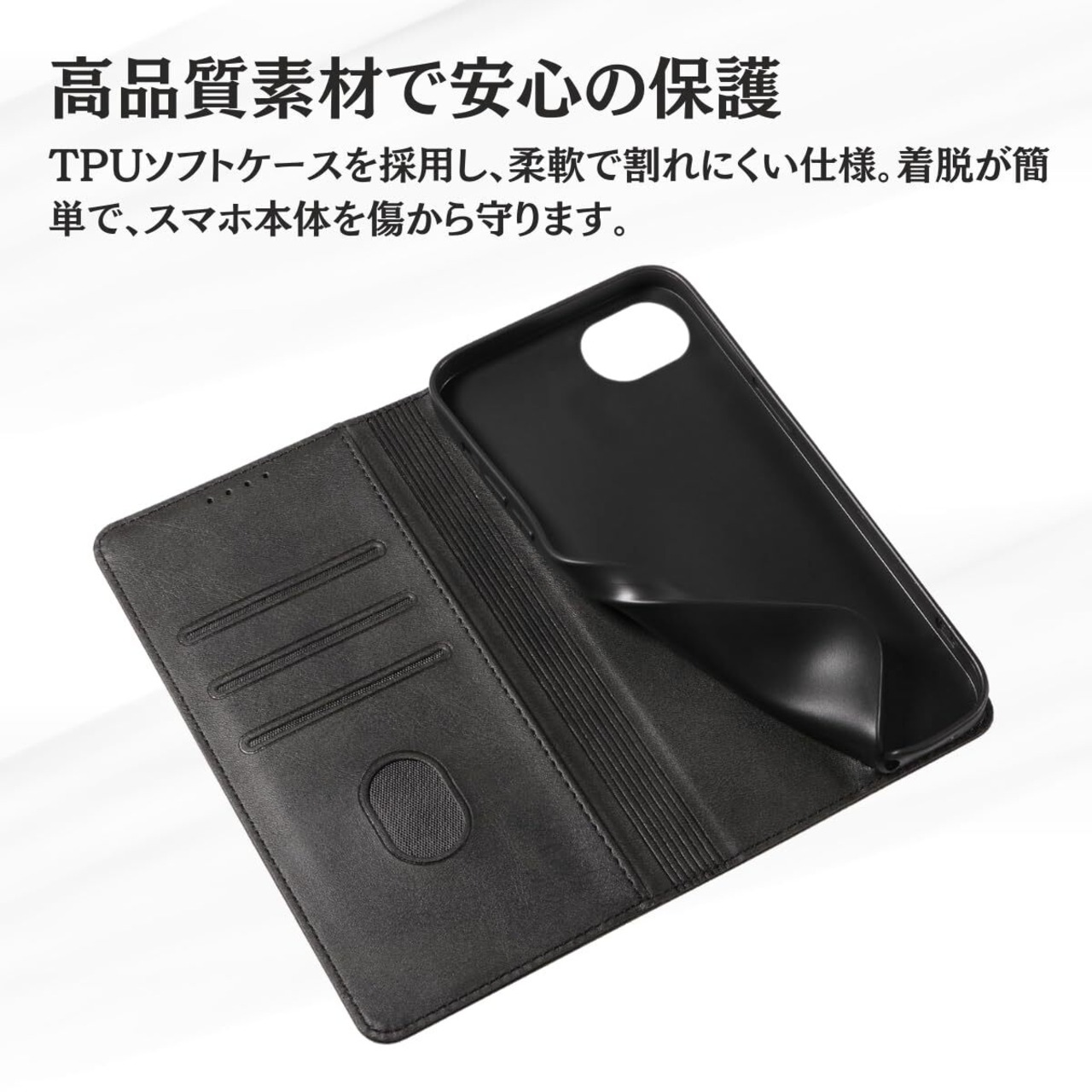 【多重保護】四隅のラウンド加工とTPUソフトケースにより、衝撃吸収性能を強化。本体を360°保護し、取り付け・取り外しも簡単でスマホ本体への傷を防ぎます。マグネット式のフリップカバーを採用し、しっかり固定でき、開閉もスムーズです。