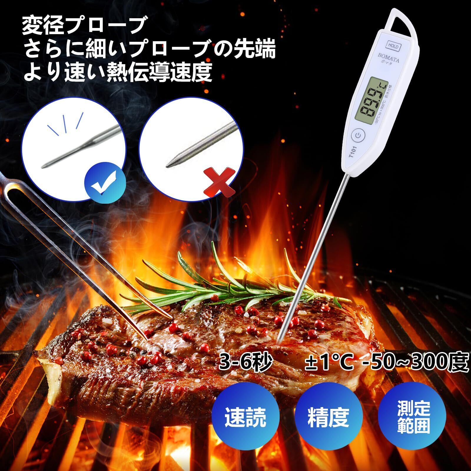 【速読3~6秒,広い測温範囲】変径プローブを使用、さらに細いプローブの先端、普通の太いプローブと比べて伝導スピードが早く、読み取り時間は僅か3-6秒です。測定温度範囲: -50~300度、最小表示: 0.1度、精度は±1°C (0˚C~150˚C) 、±2˚Cその他の範囲。