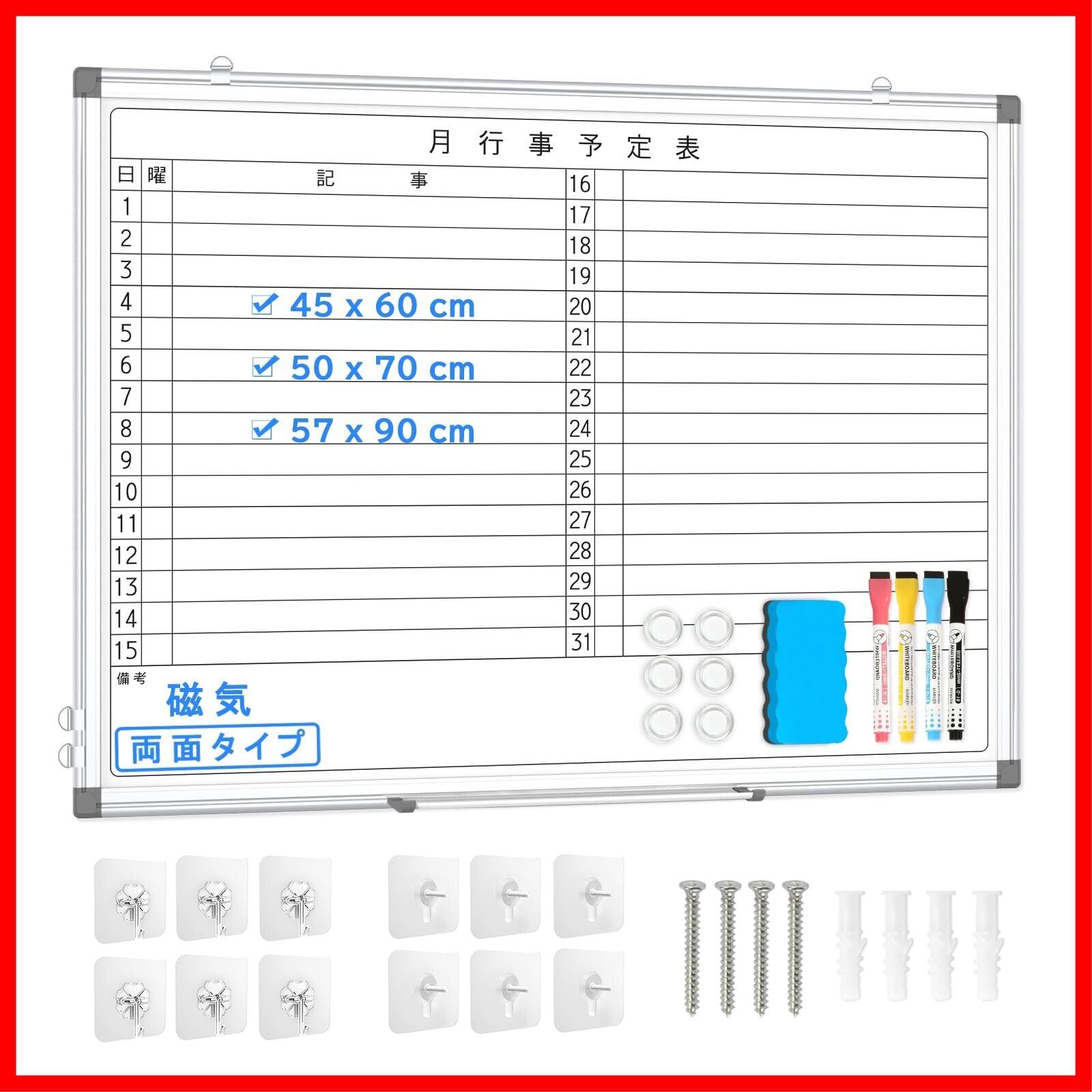 Walspax ホワイトボード 月予定表 壁掛 70x50cm マグネット ホワイトボード 罫線 月間予定表 行動予定表 ボード 両面使用 縦横兼用 アルミフレーム スケジュール帳 お支度ボード スケジュールボード ホワイトボード カレンダー おしゃれ 備考 家庭用 オフィス用品 マーカー・イレイザー付き