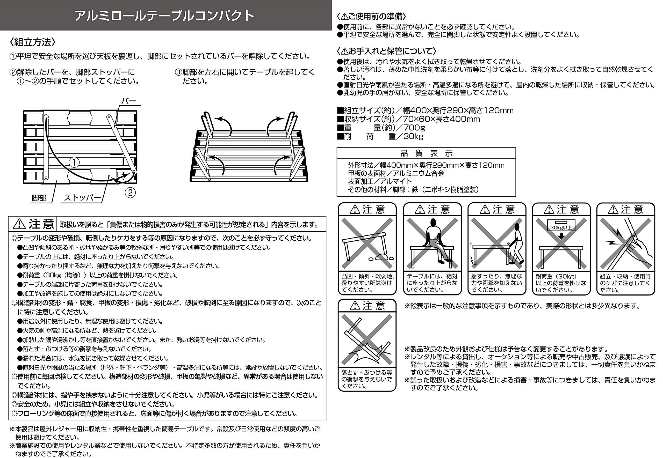 材質:甲板/アルミニウム合金(表面加工=アルマイト)、脚部/鉄(エポキシ樹脂塗装)、原産国:台湾