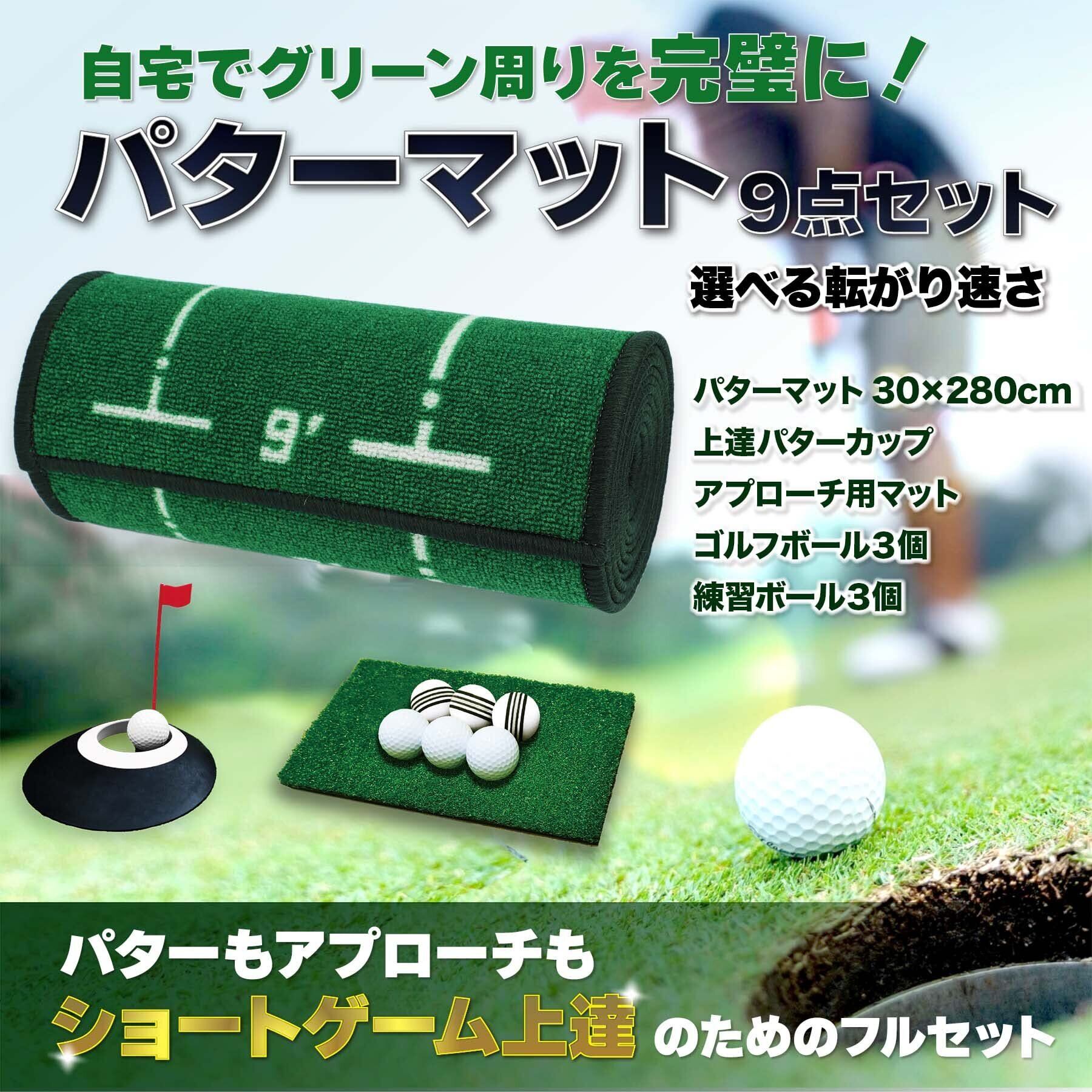 【セット内容】パターマット本体 / 上達パターカップ / ゴルフボール3個 / ショットマット / 練習用ボール 3個 計9点セット 【仕様】 パターマット: 30*280cm / パターカップ:外径 18*20cm 内径 10.8cm&7.6cm(2段階)/ ゴルフボール: 直径42.7mm 2ピース/ ショットマット: 20*30*2cm SBR製 / ゴルフ練習ボール: 直径42mm EVA製