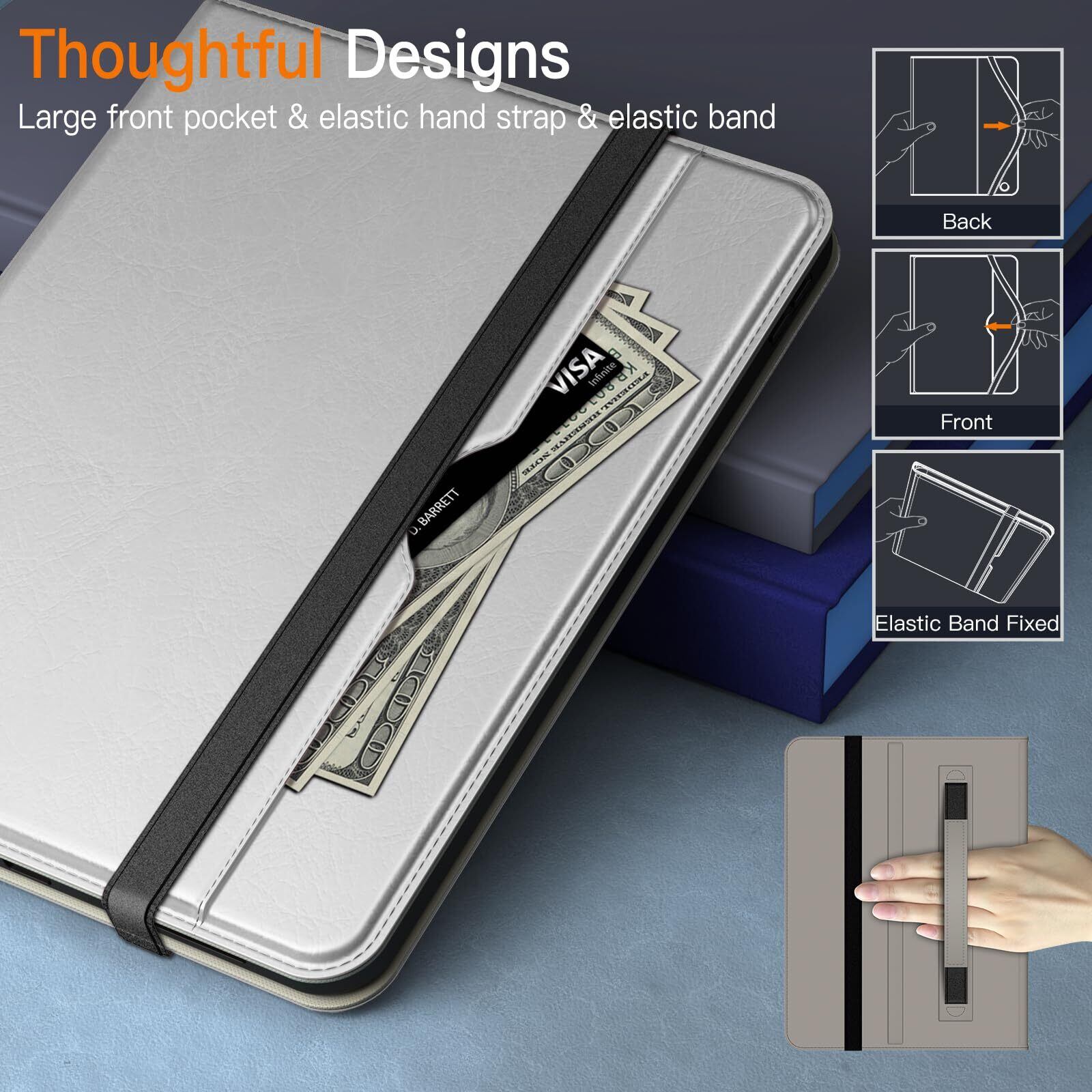 [多機能] カード、現金、メモなどを収納できる大きなフロントポケット。また、iPadをケースにしっかりと固定するための外側の伸縮性のあるストラップが付属しており、調節可能な内側のハンドストラップはiPadをしっかりと保持するのに役立ちます