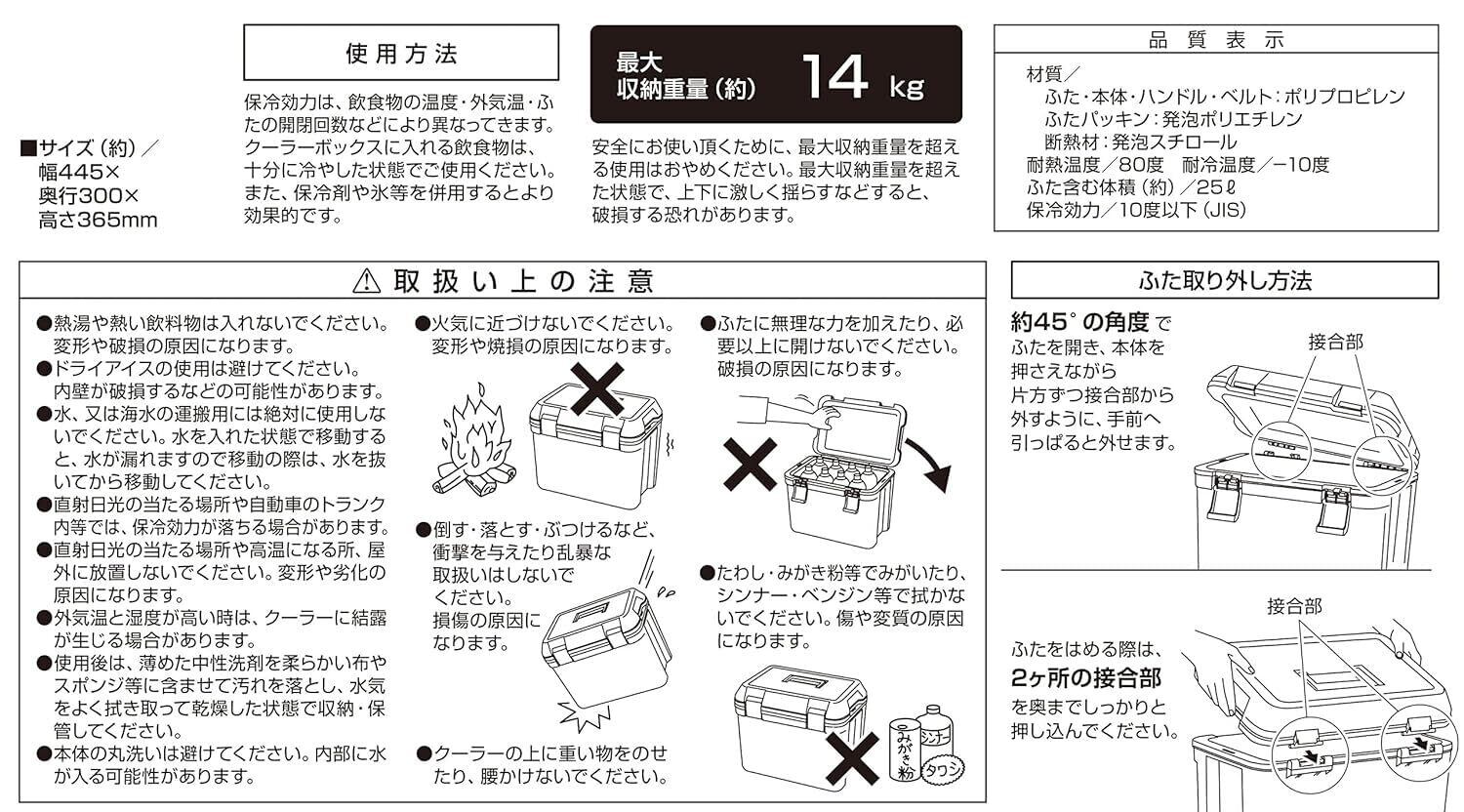 材質:ふた・本体・ハンドル・ベルト/ポリプロピレン、ふたパッキン/発泡ポリエチレン、断熱材/発泡スチロール、耐熱温度/80度、耐冷温度/-10度、原産国:日本