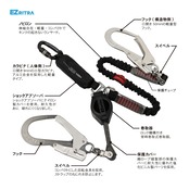 仕様:ロック機構付き巻取式ツインランヤード(副ランヤードはロック機構なし伸縮ロープ式)、フルハーネス/胴ベルト兼用型