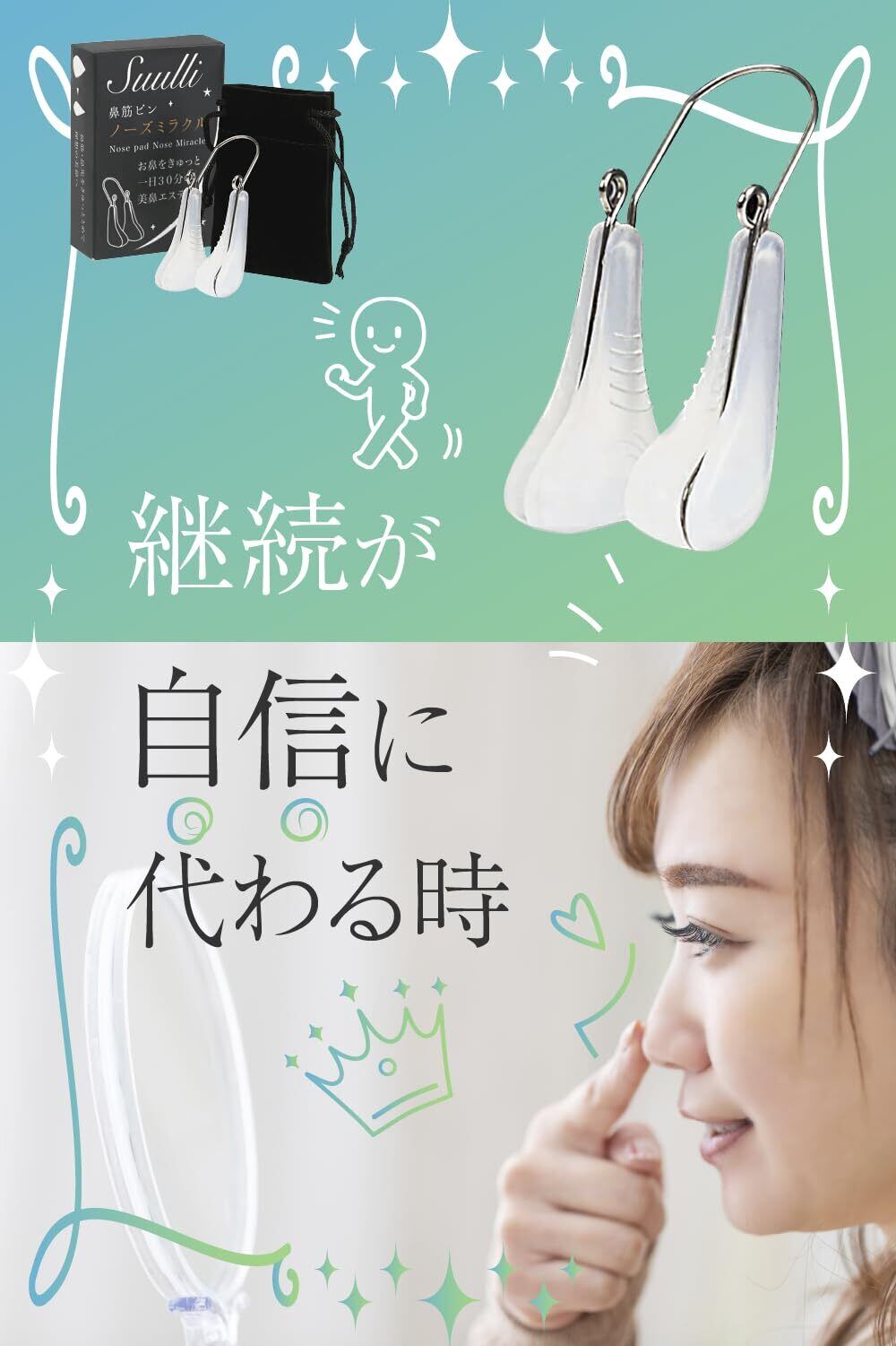 【SUULLI ノーズクリップ】自宅で隙間時間に1日10分からはじめれる鼻エステ Suulli ノーズクリップです。家事をしながら、本やテレビを見ながらリラックスタイムに 1回10分装着するだけ!10分でも充分ですが、慣れてくれば1日20、30分を目指してください!